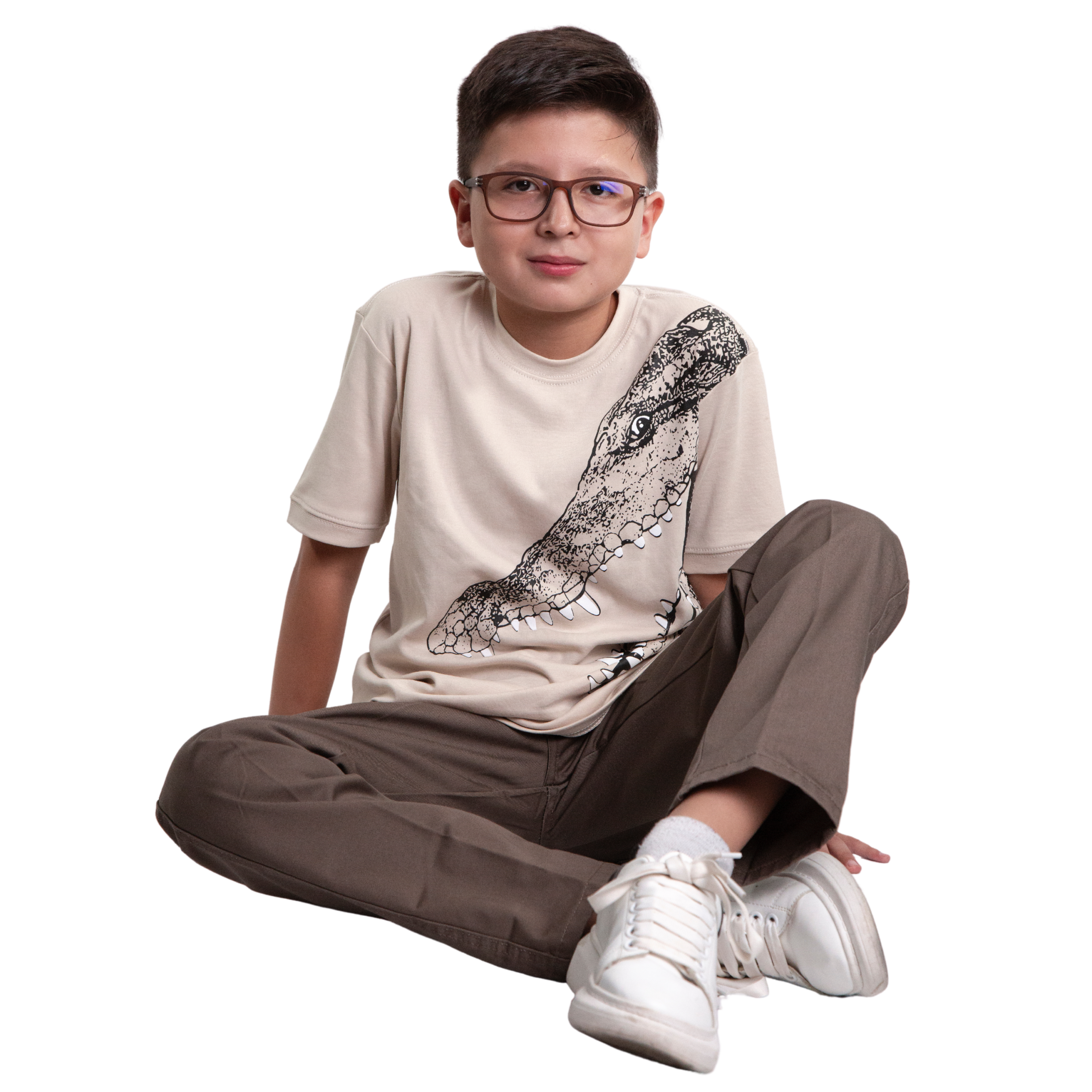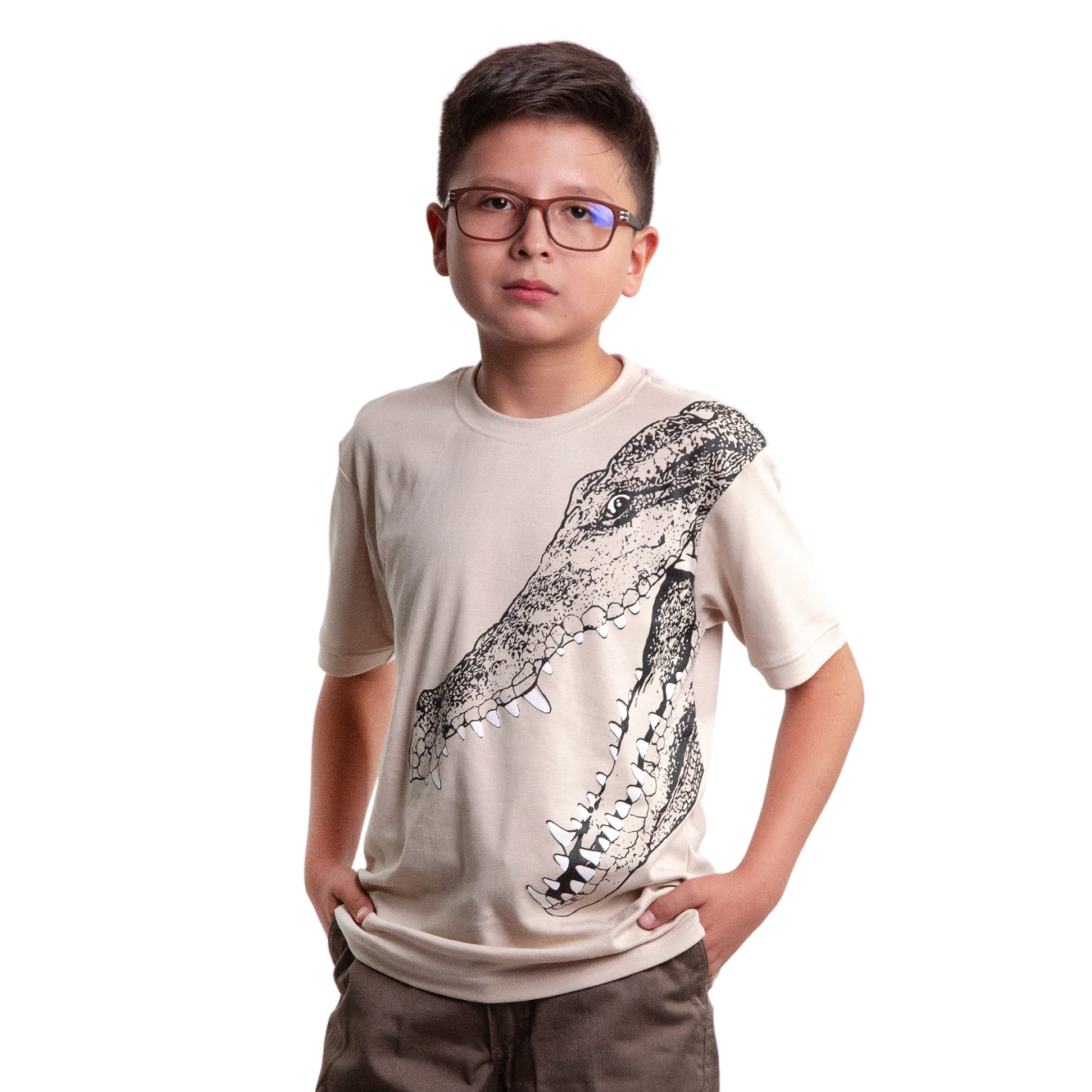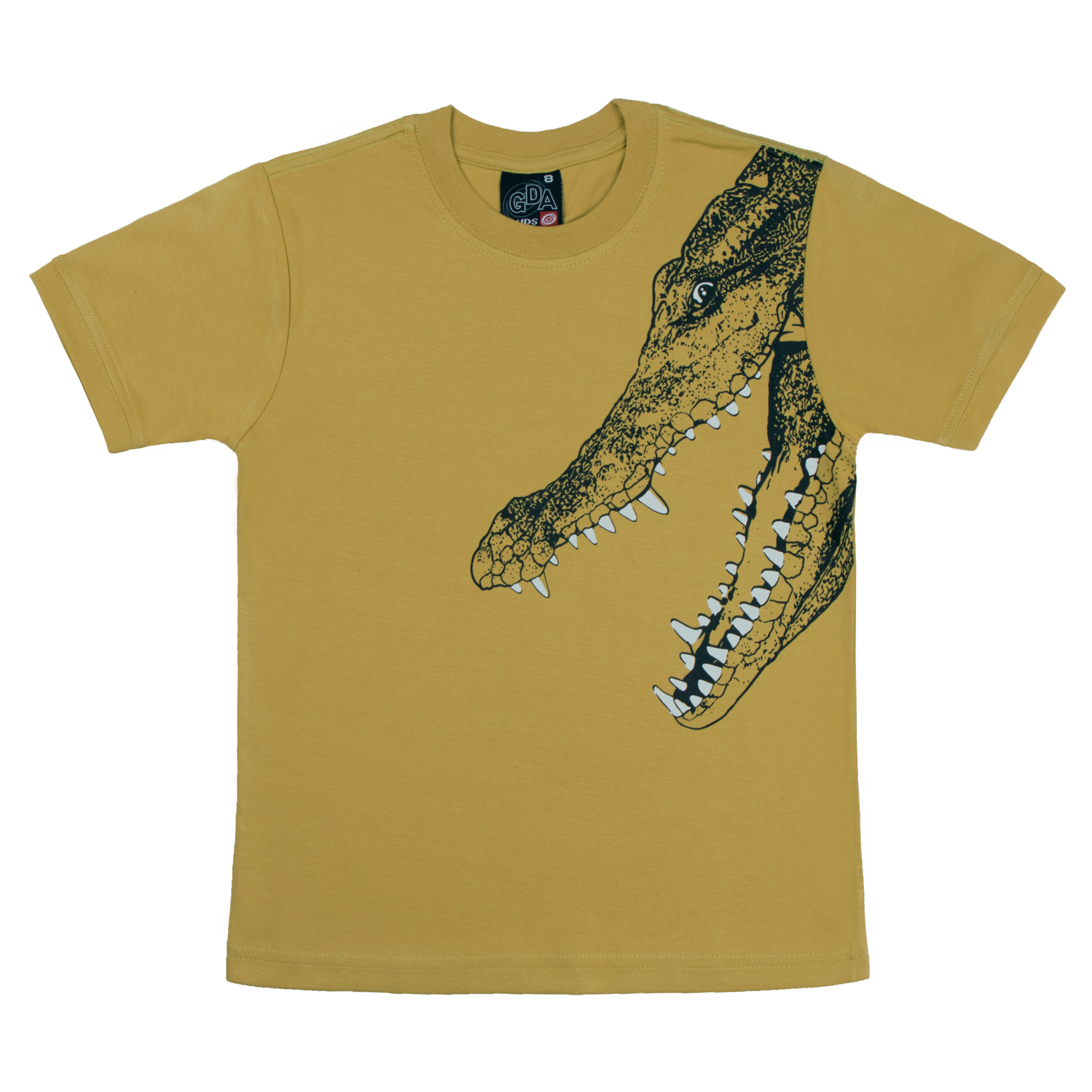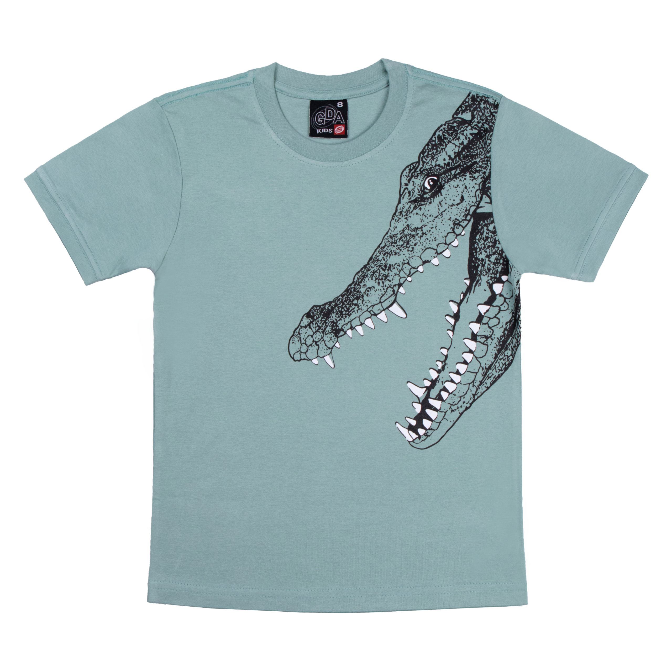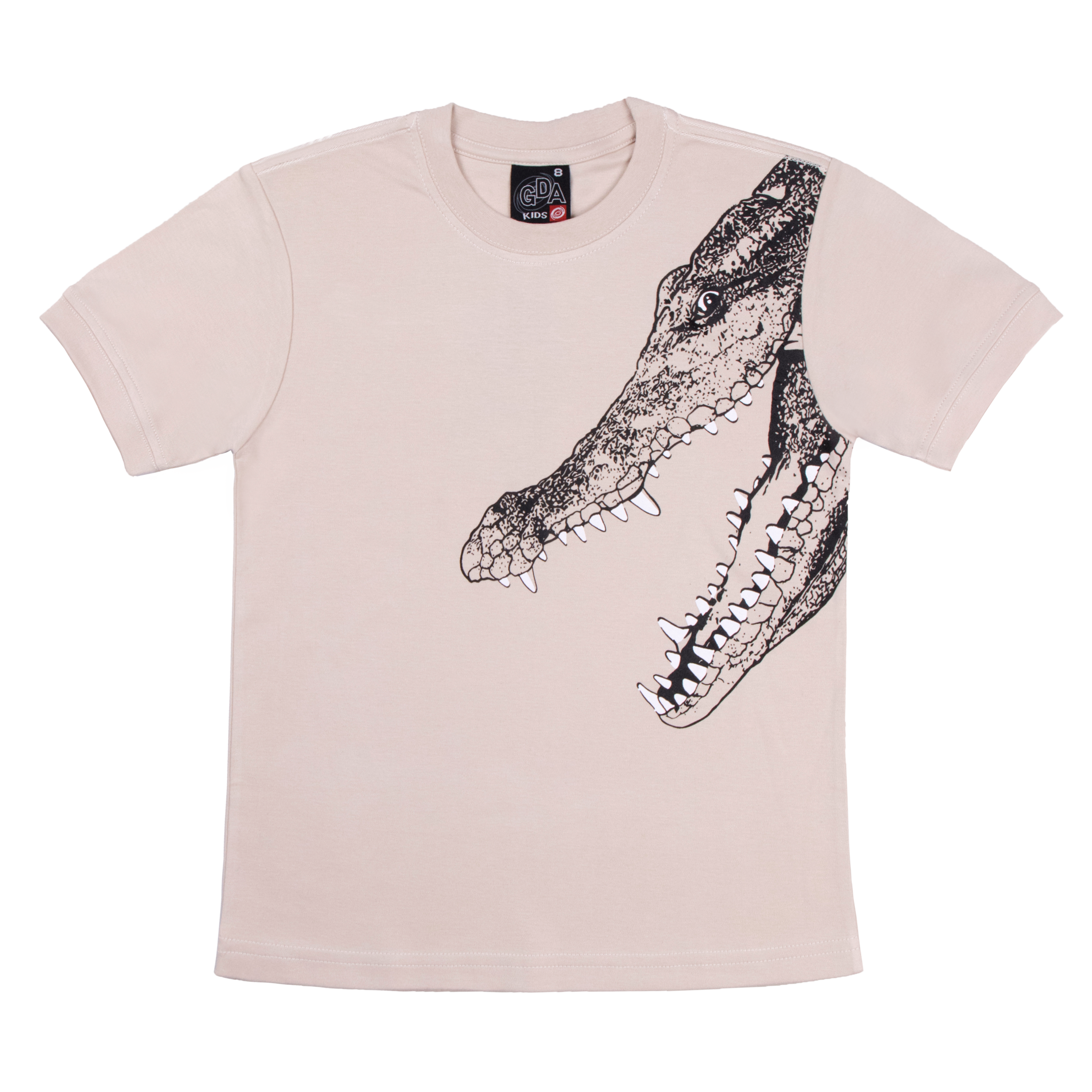 Polera manga corta color entero en tela algodón cuello redondo con estampado de cabeza de cocodrilo con la boca abierta en el lado superior izquierdo. Talles 4, 6,8, 10, 12 y 14