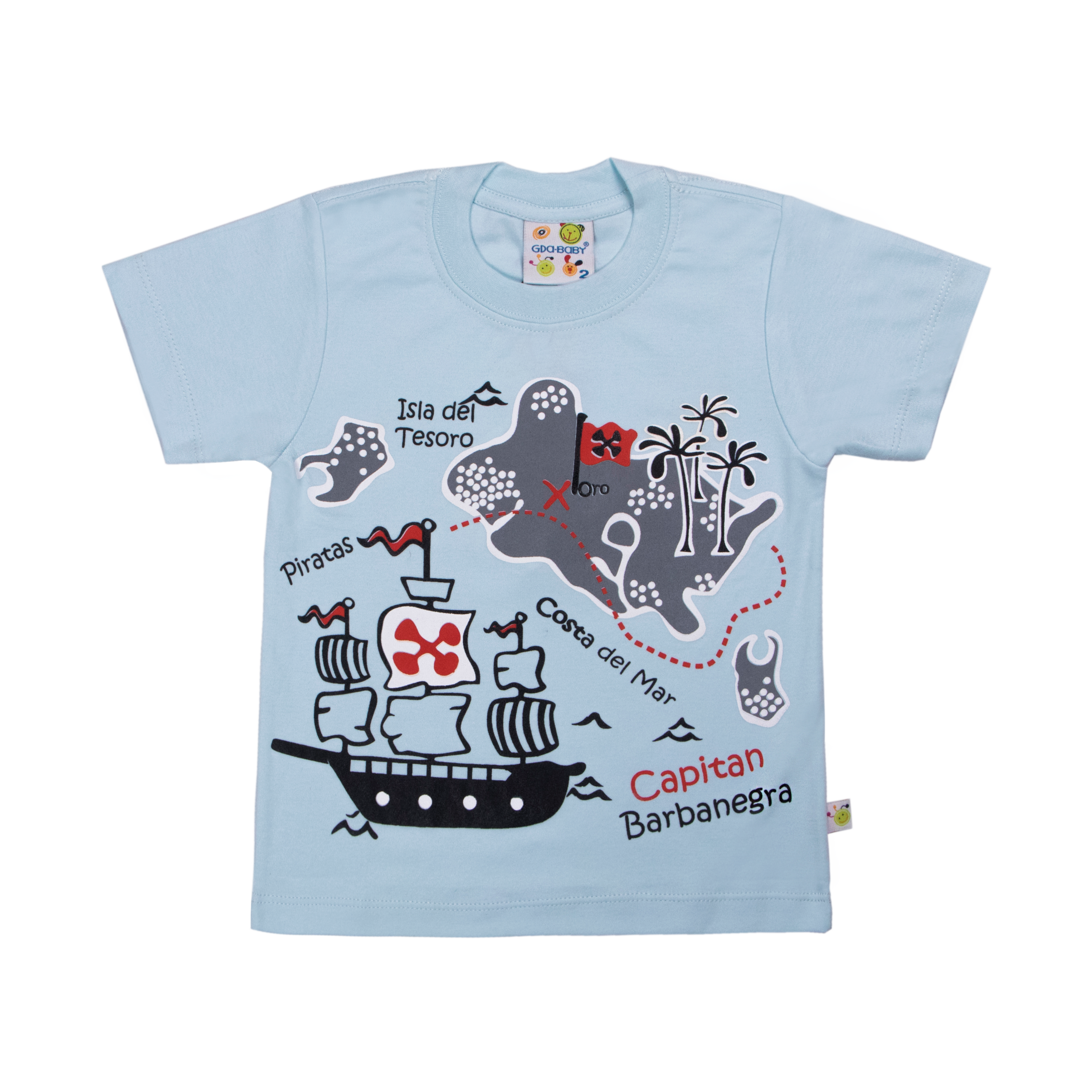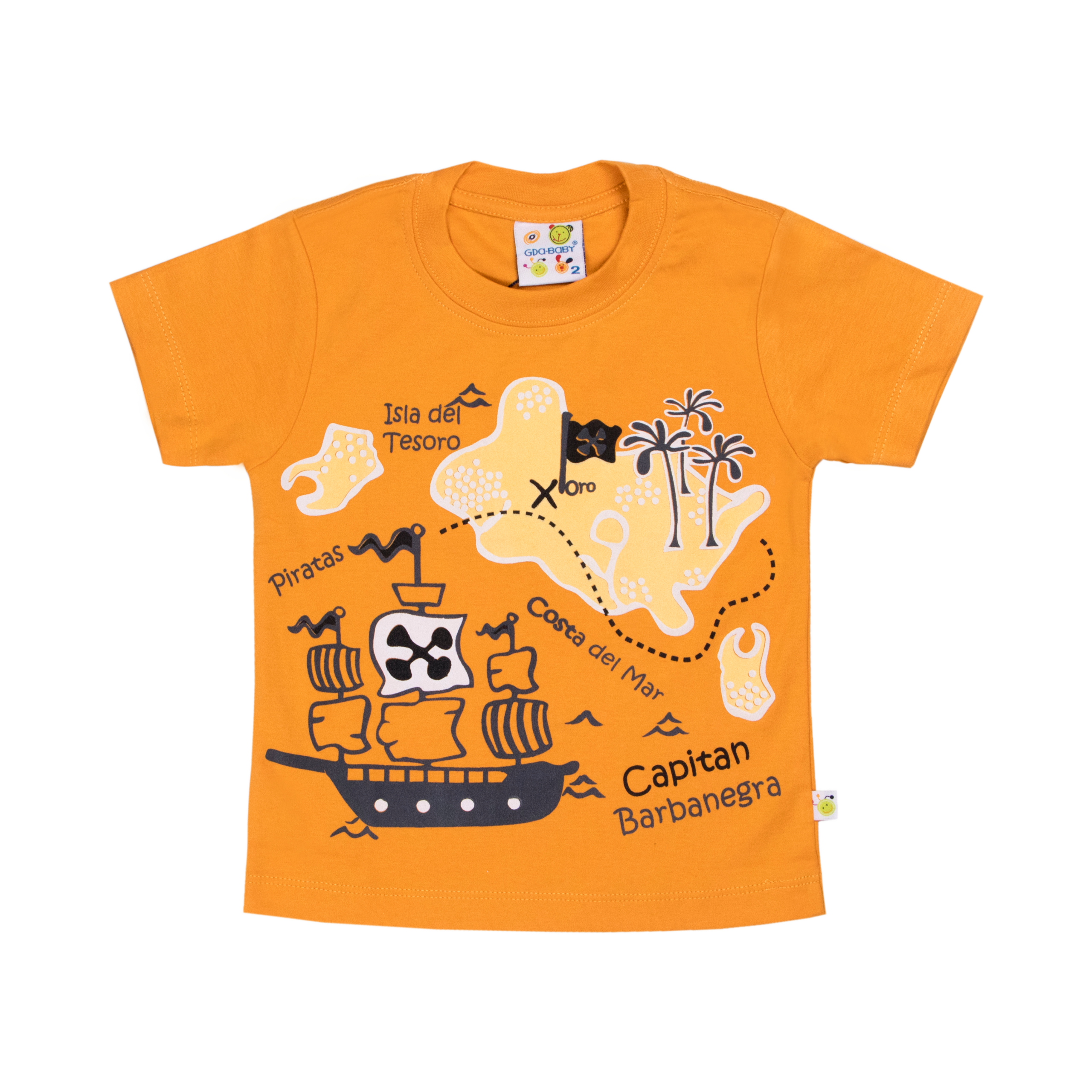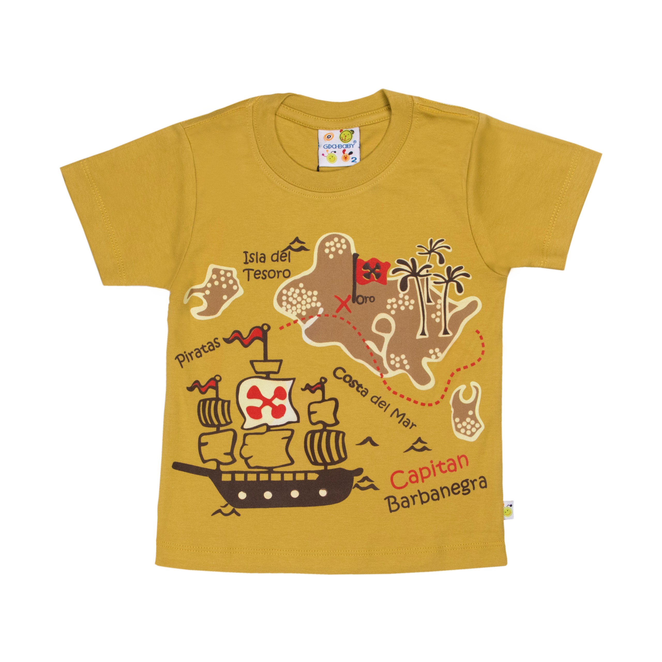 Polera manga corta de tela algodón en color entero con estampado de mapa isla del tesoro en talles 1, 2 y 3.