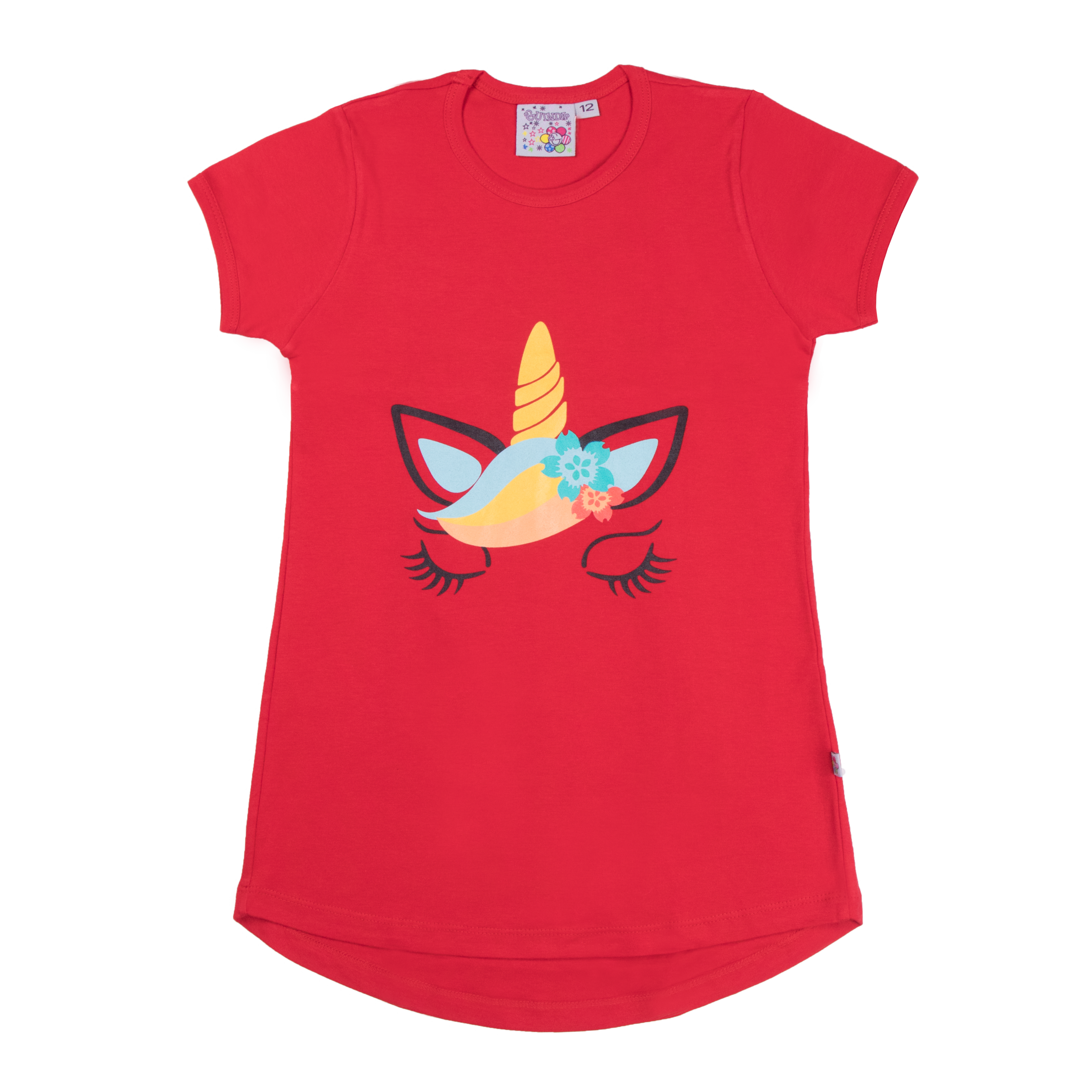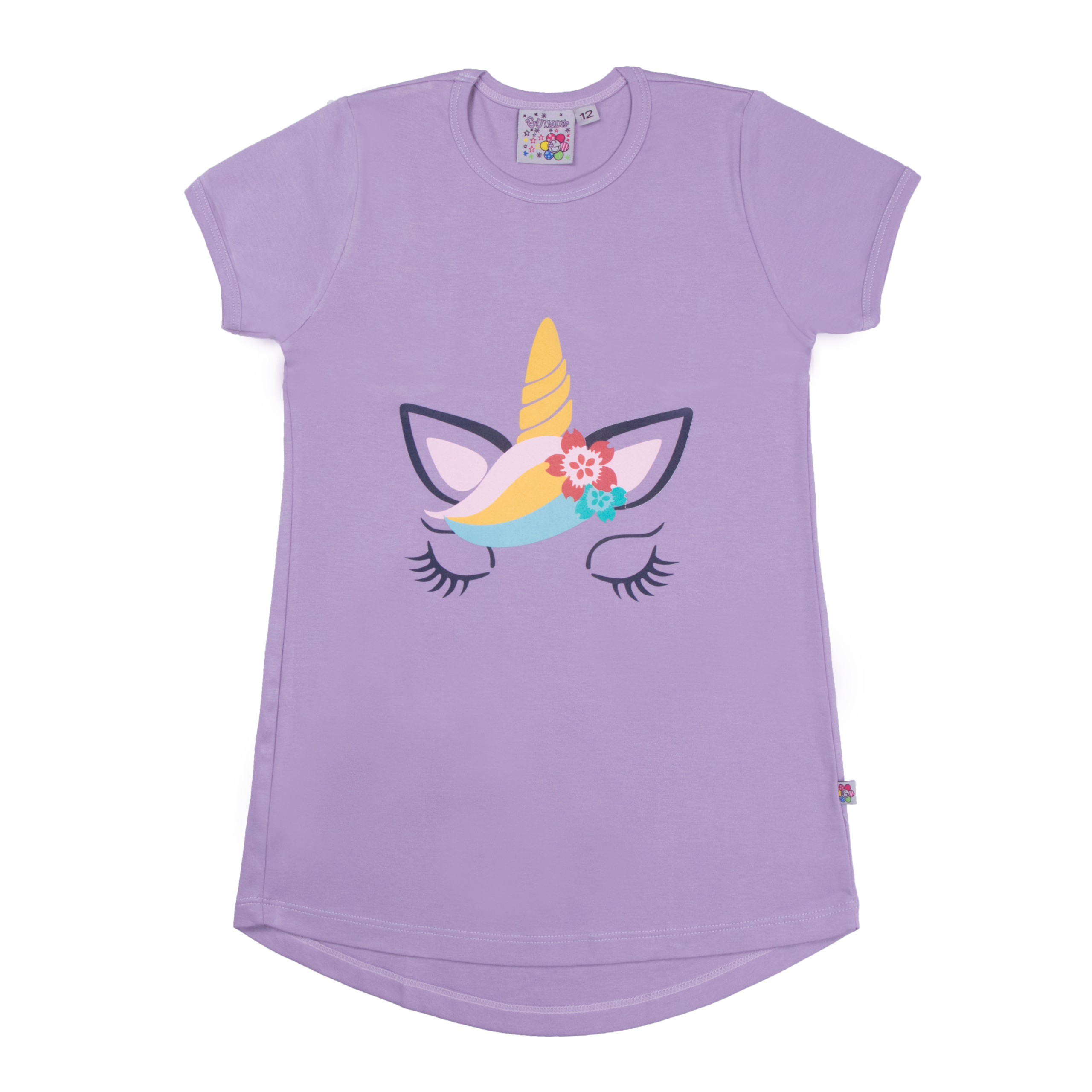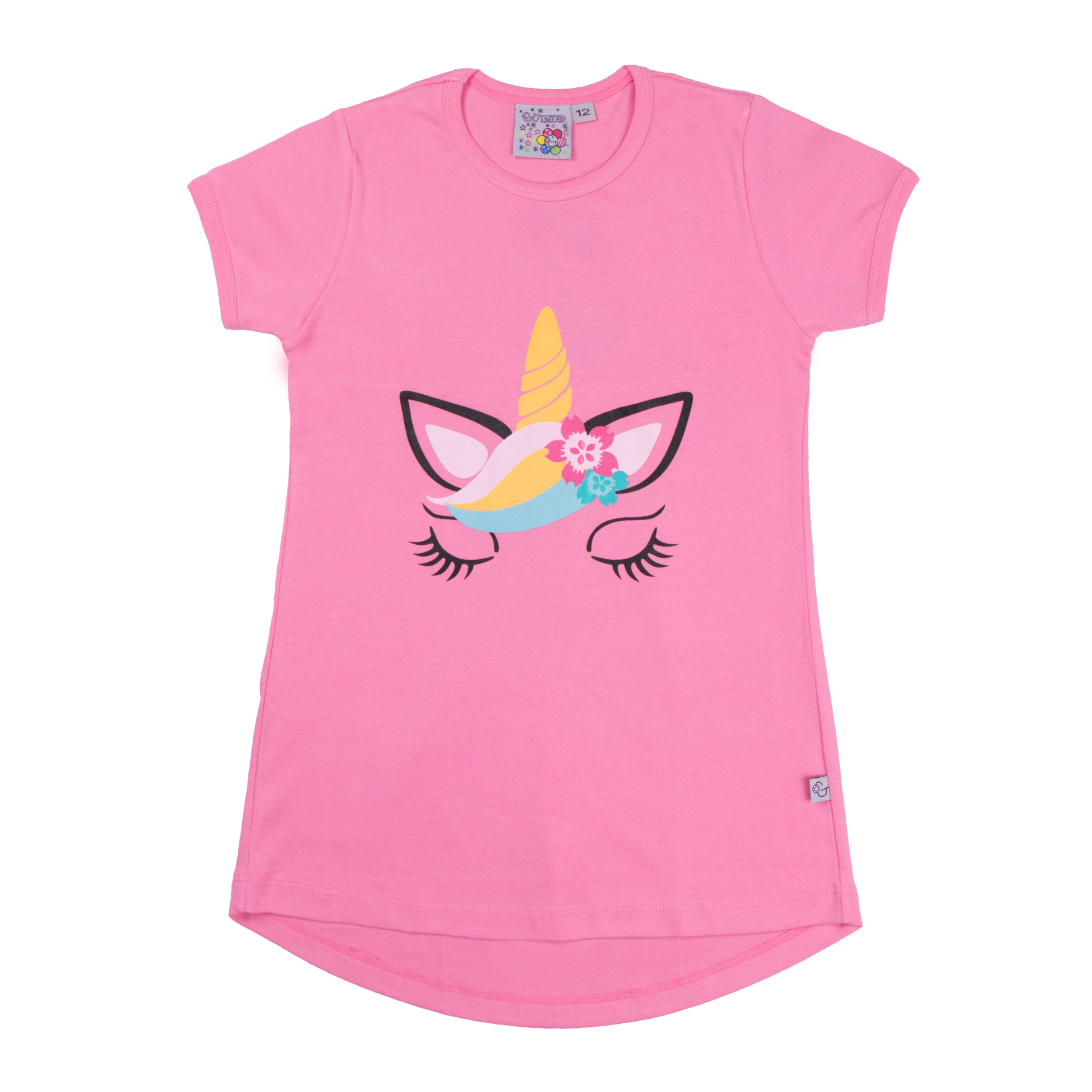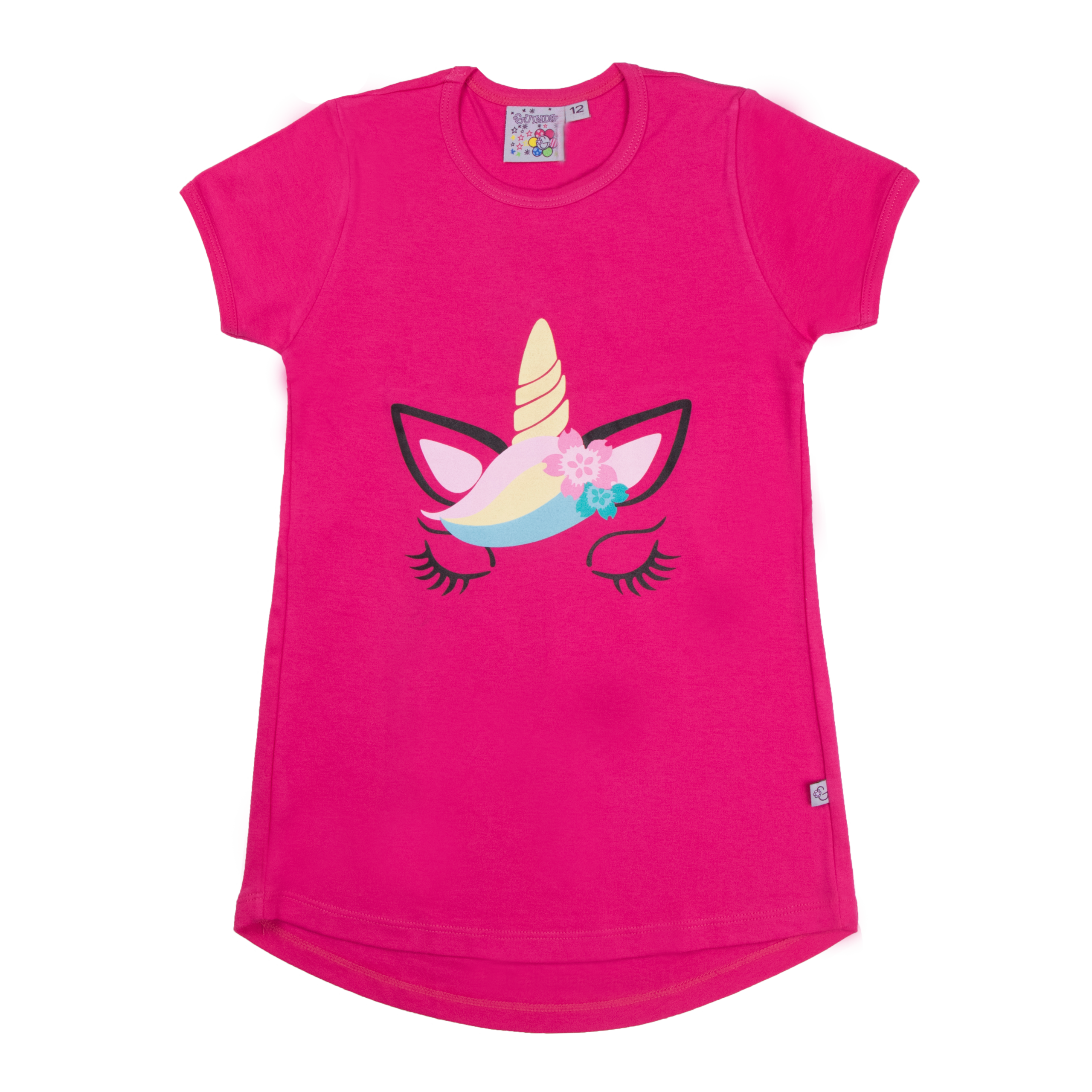 Polera color entero con mangas cortas, cola de pato y estampado de Unicornio en el frente y detalle plisado en la espalda. En tela algodón, para niñas en talles 4, 6, 8, 10, 12 y 14.