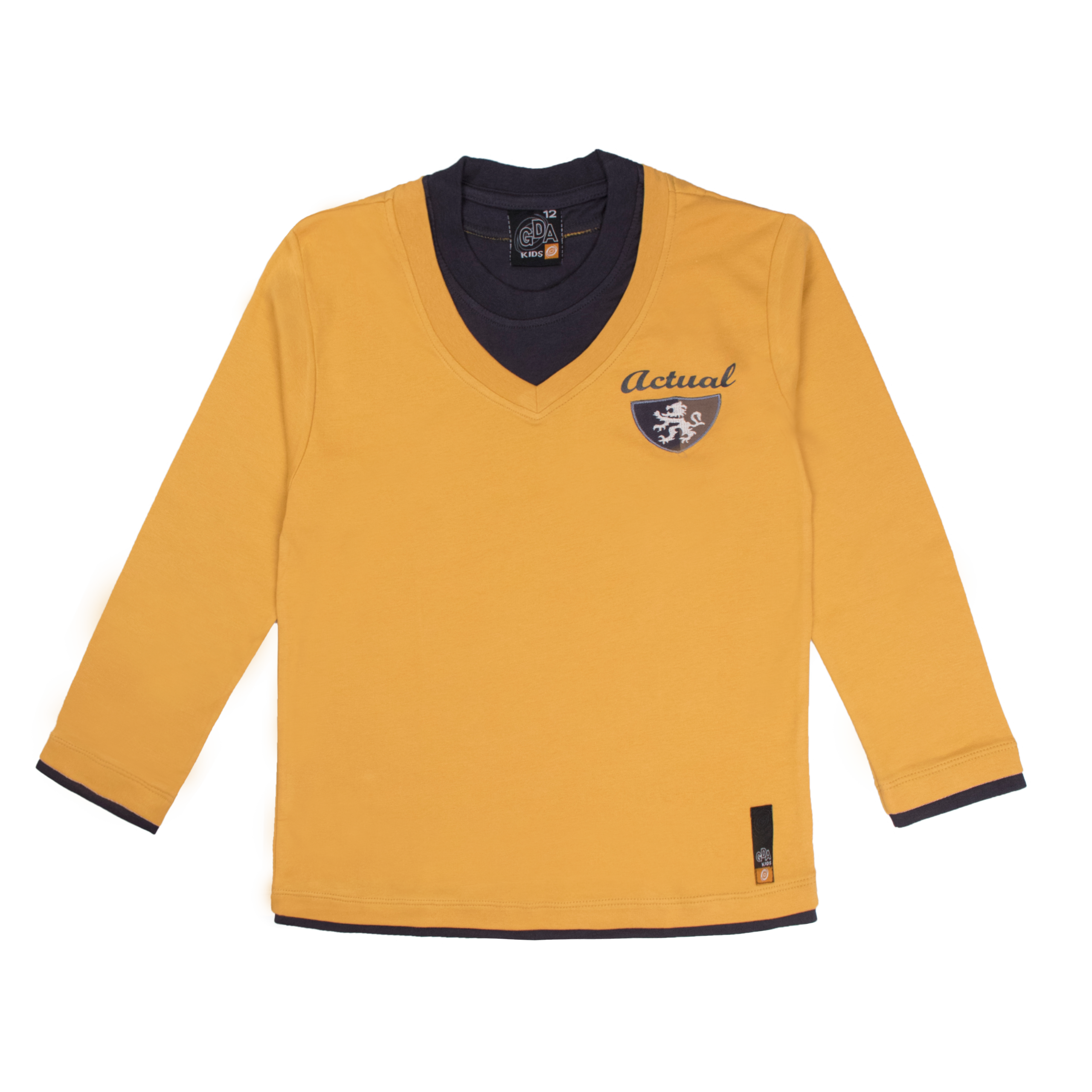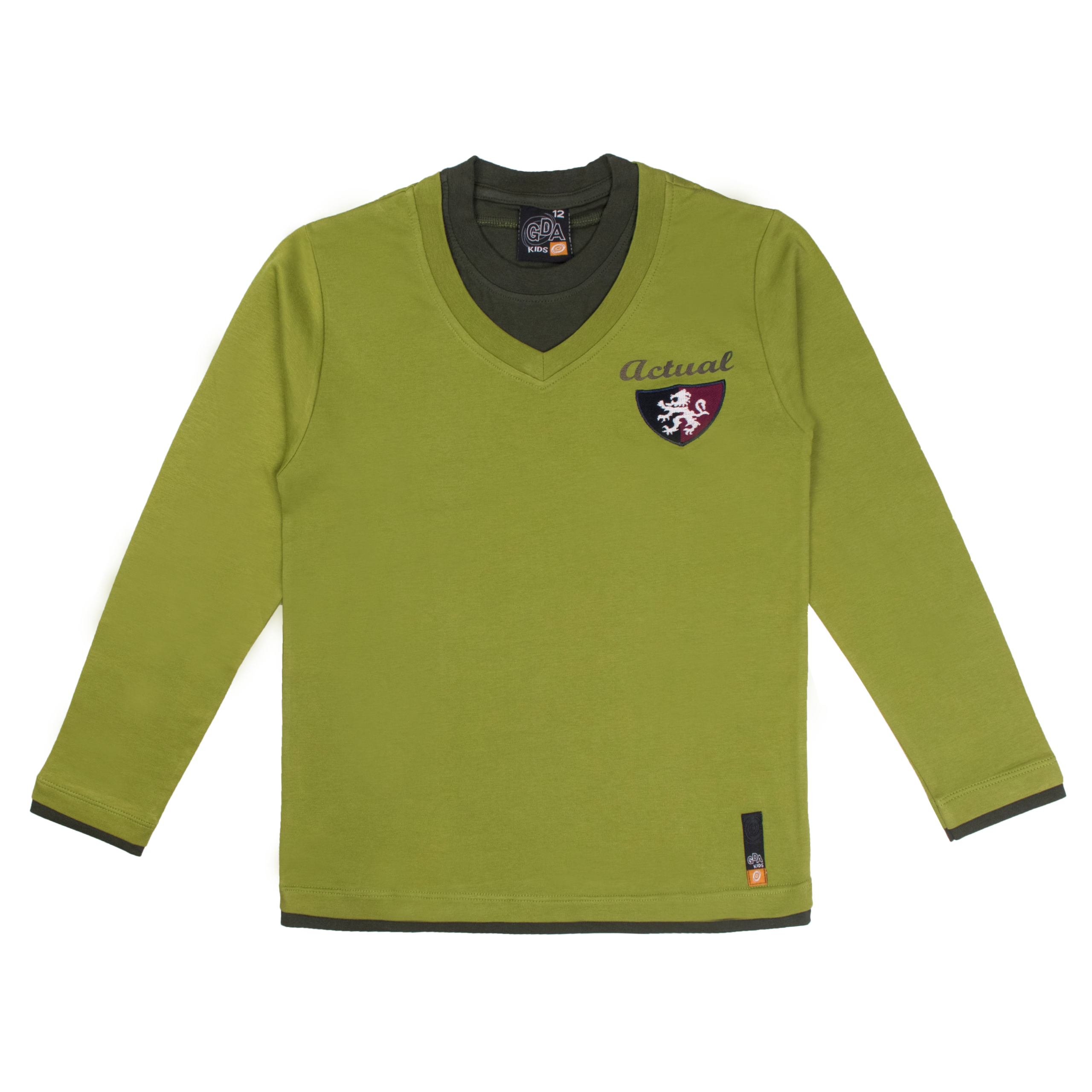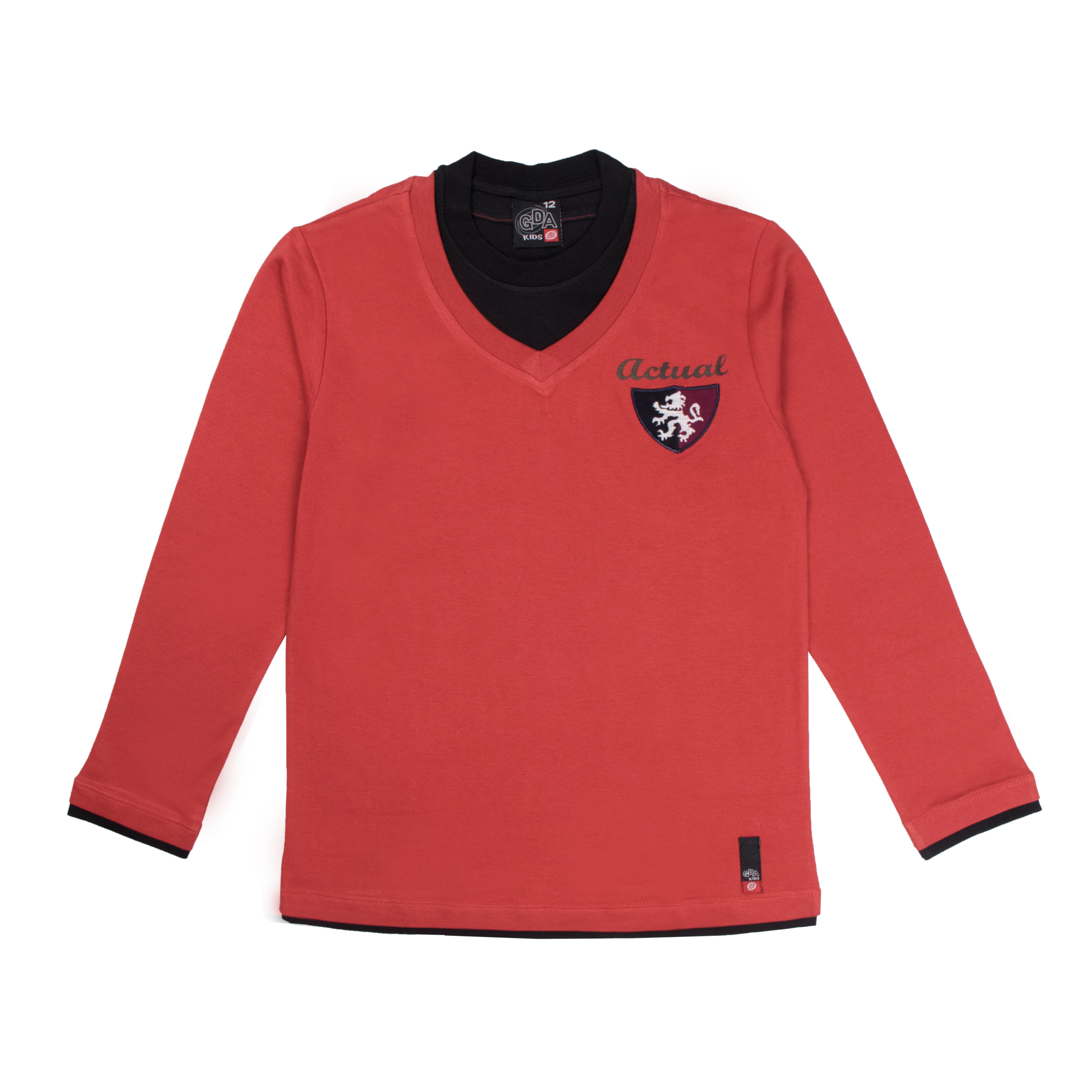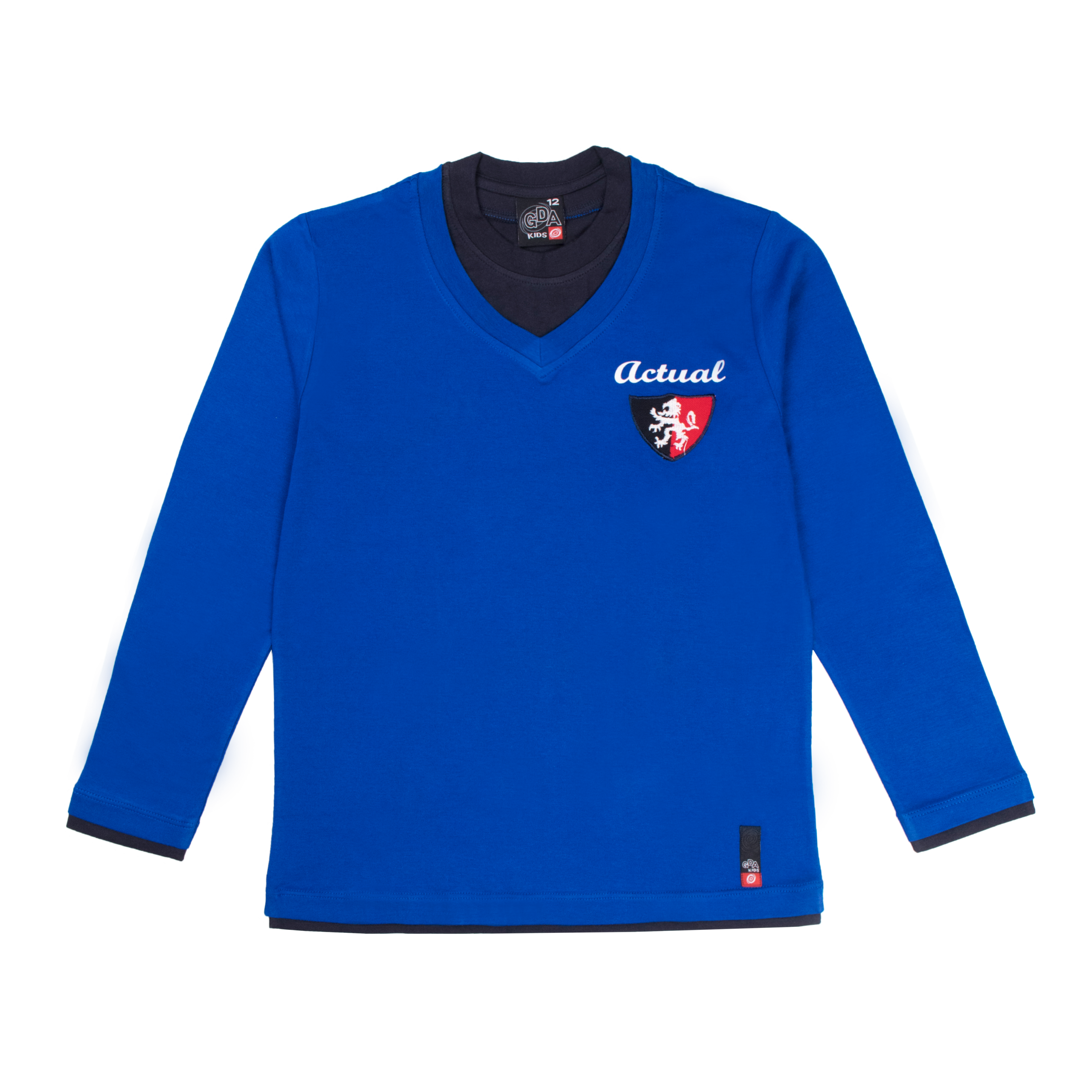 Polera manga larga en tela algodón combinado con doble cuello V, con bordado Actual para niños de talles 10, 12 y 14.