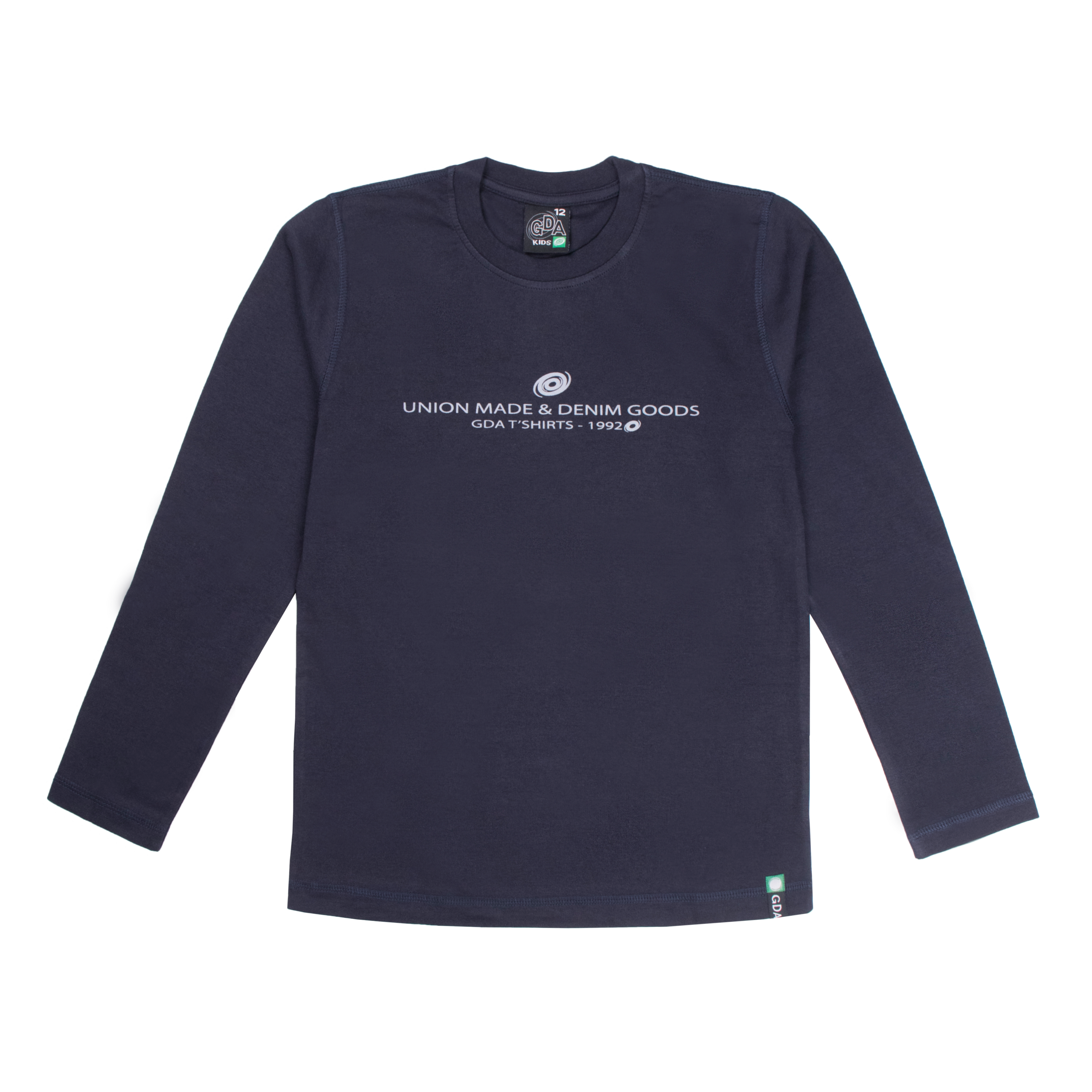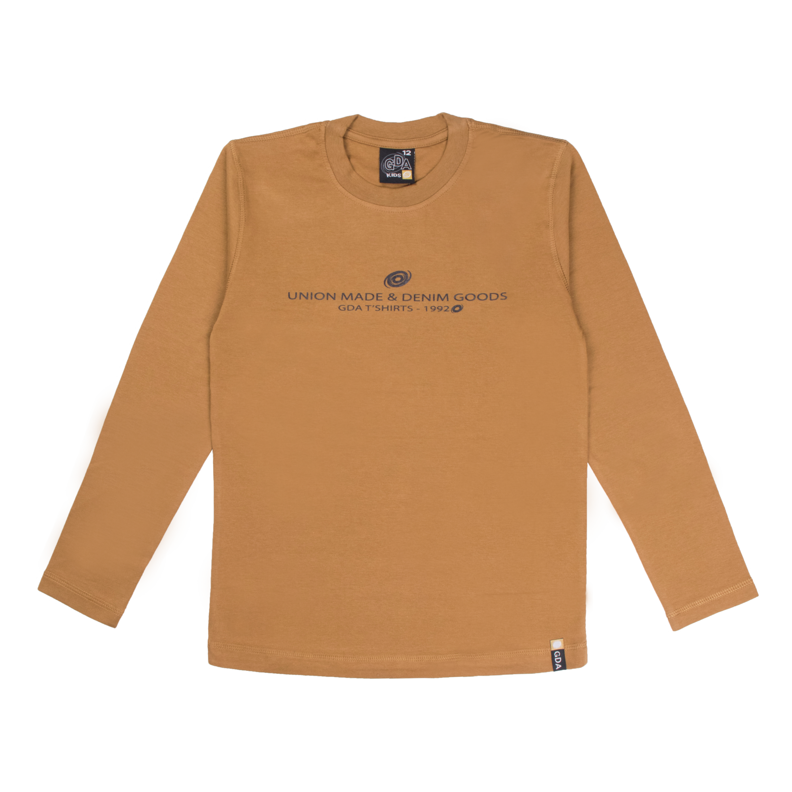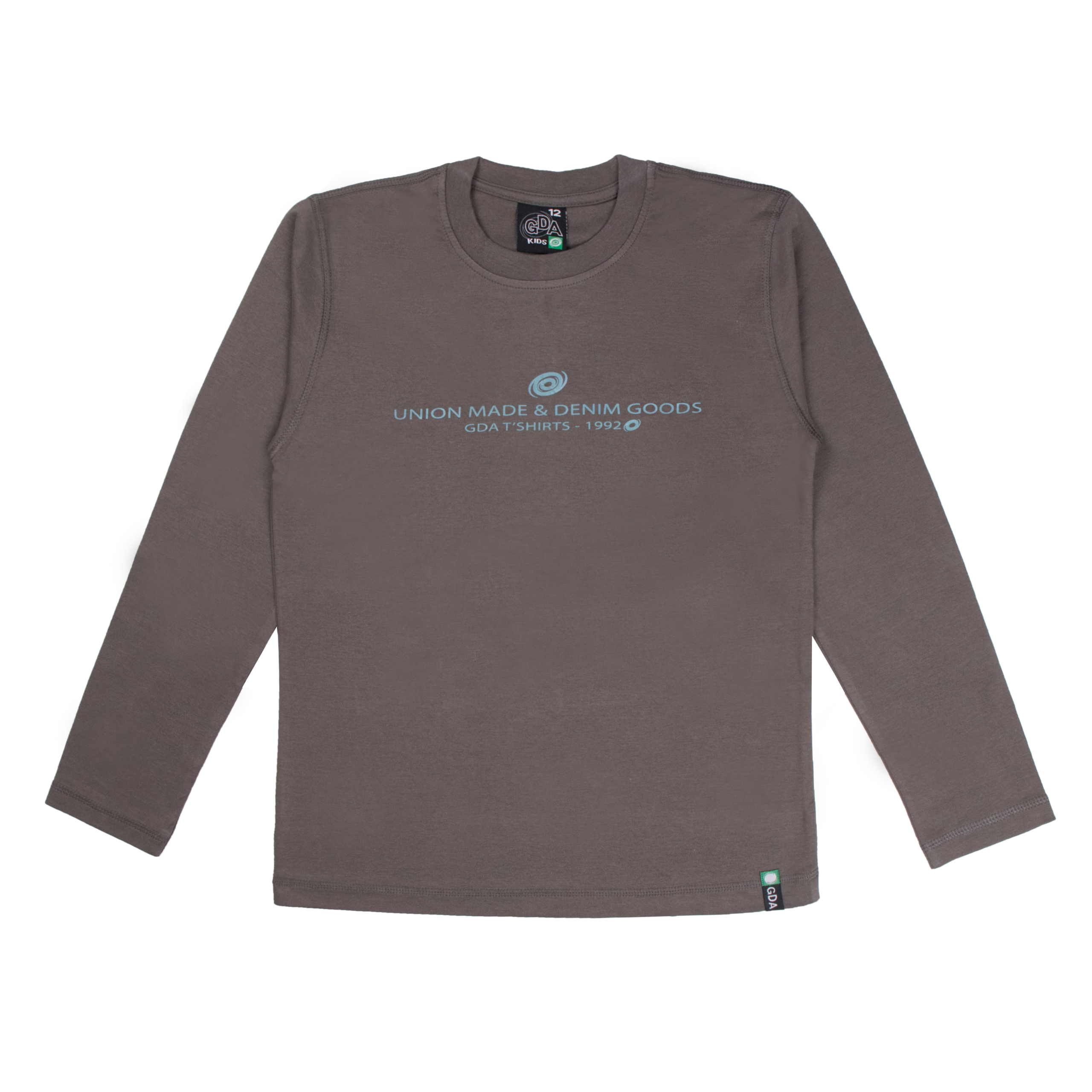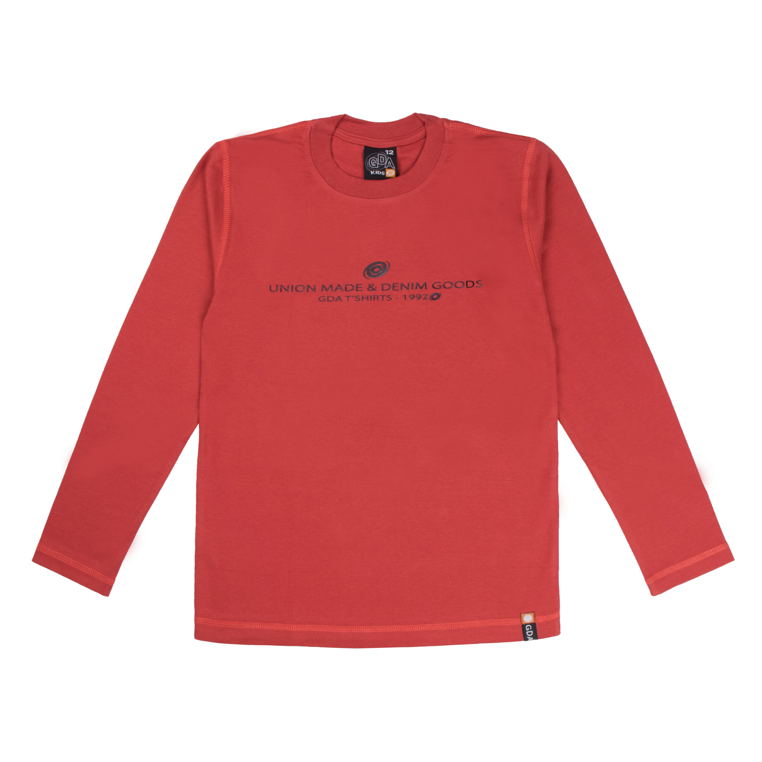 Polera manga larga en tela algodón color entero con estampado de letra y costuras bordadas. Para niños en talles 10, 12 y 14.