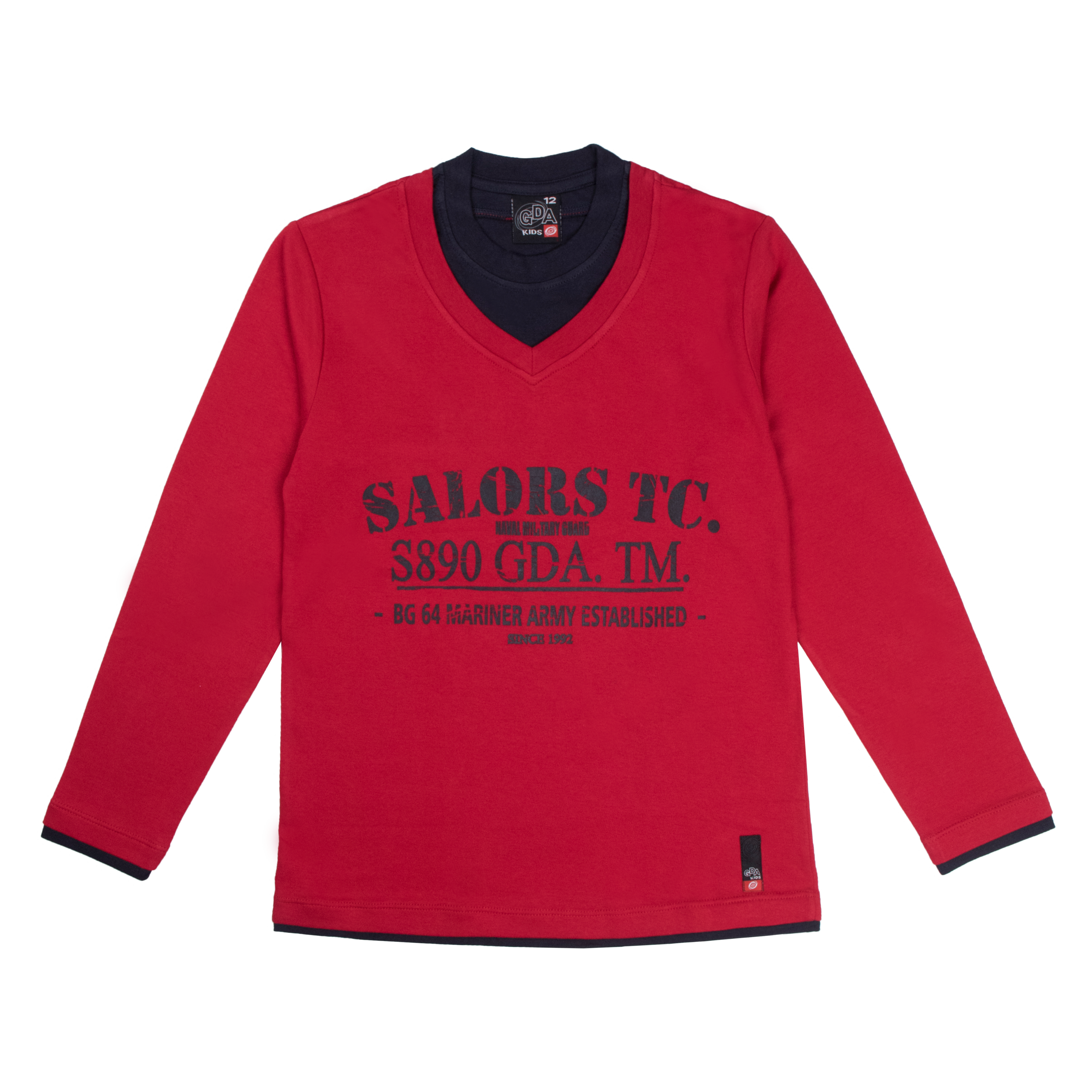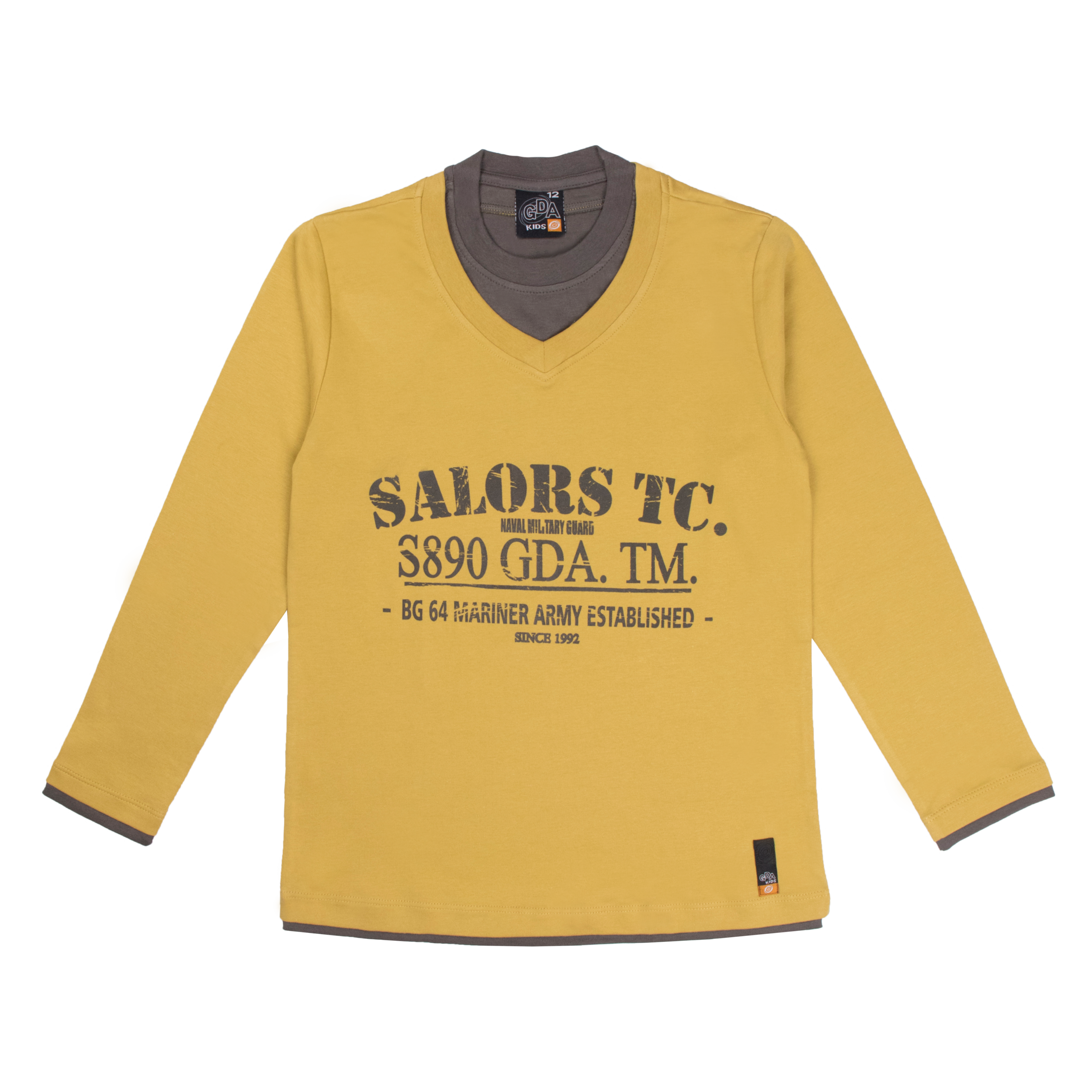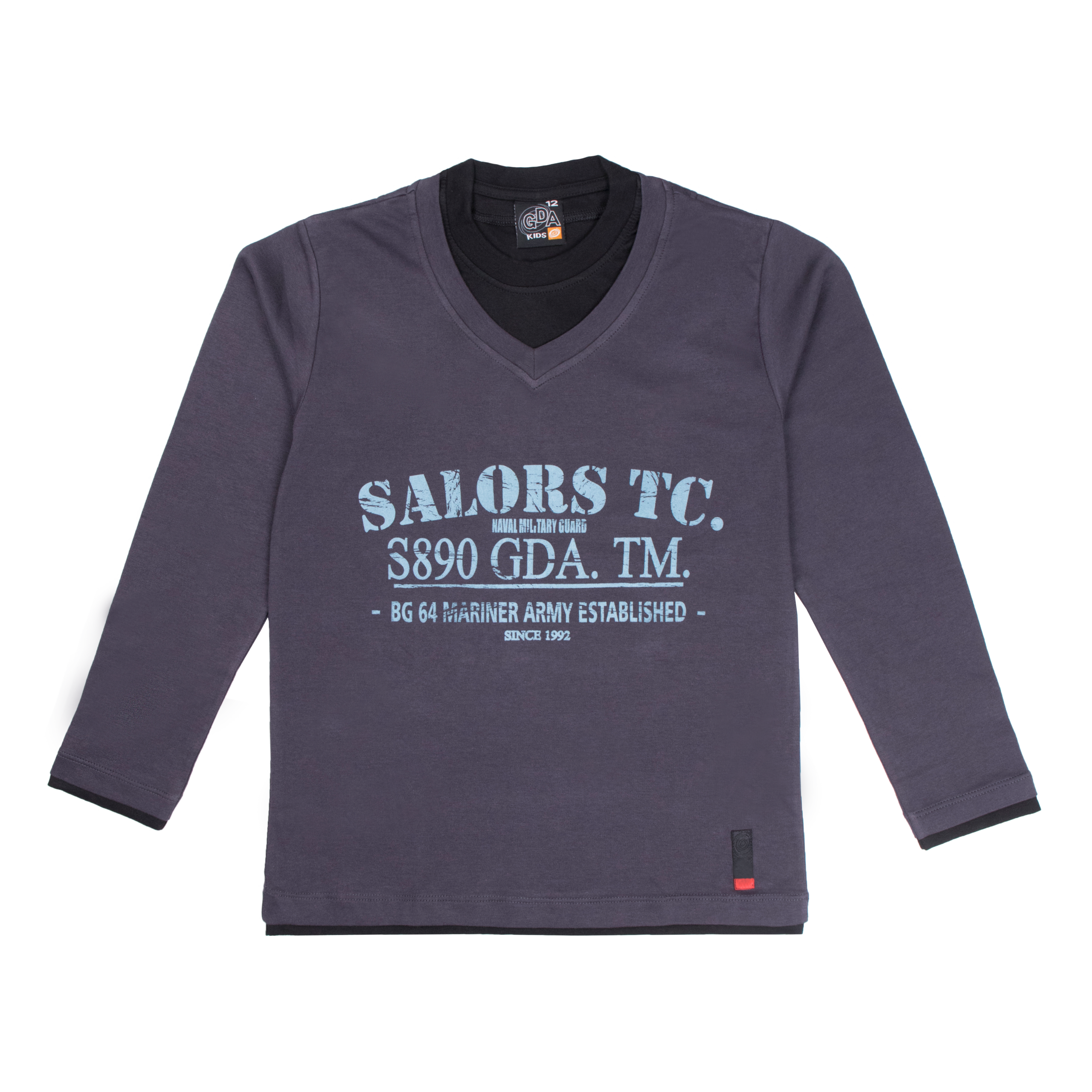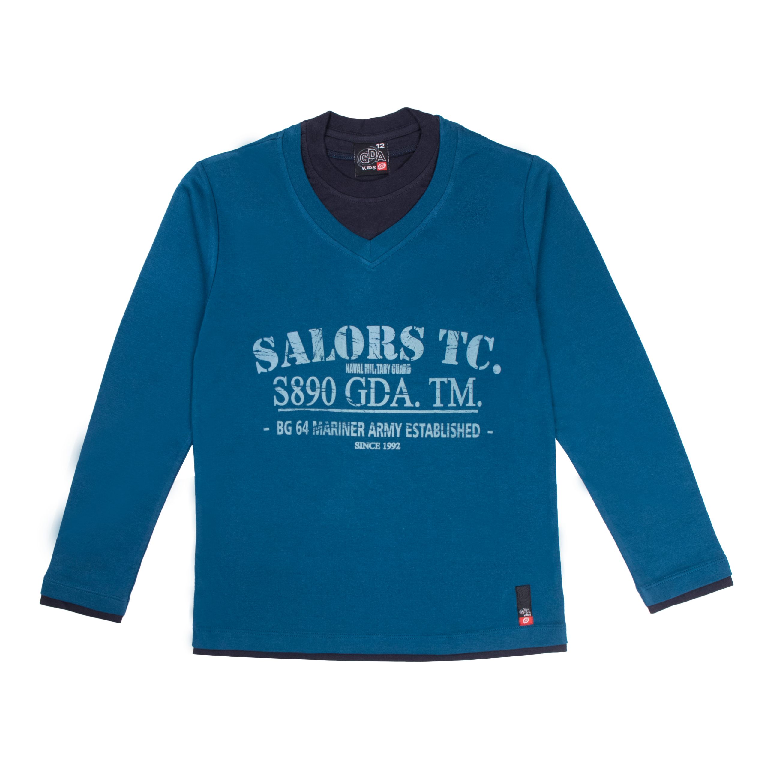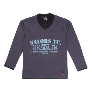 Polera manga larga en tela algodón combinado con doble cuello V, con estampado de letras para niños de talles 10,12 y 14.