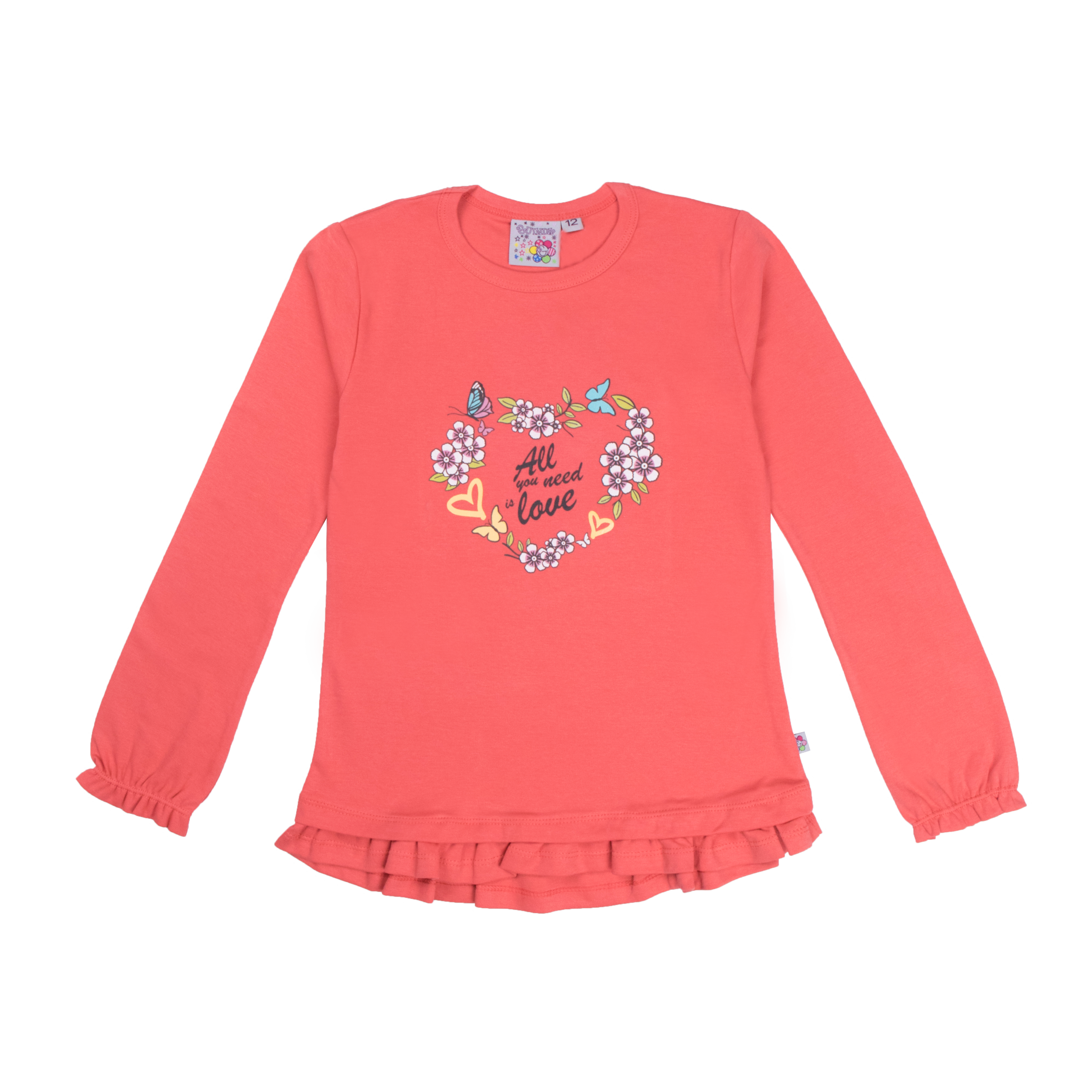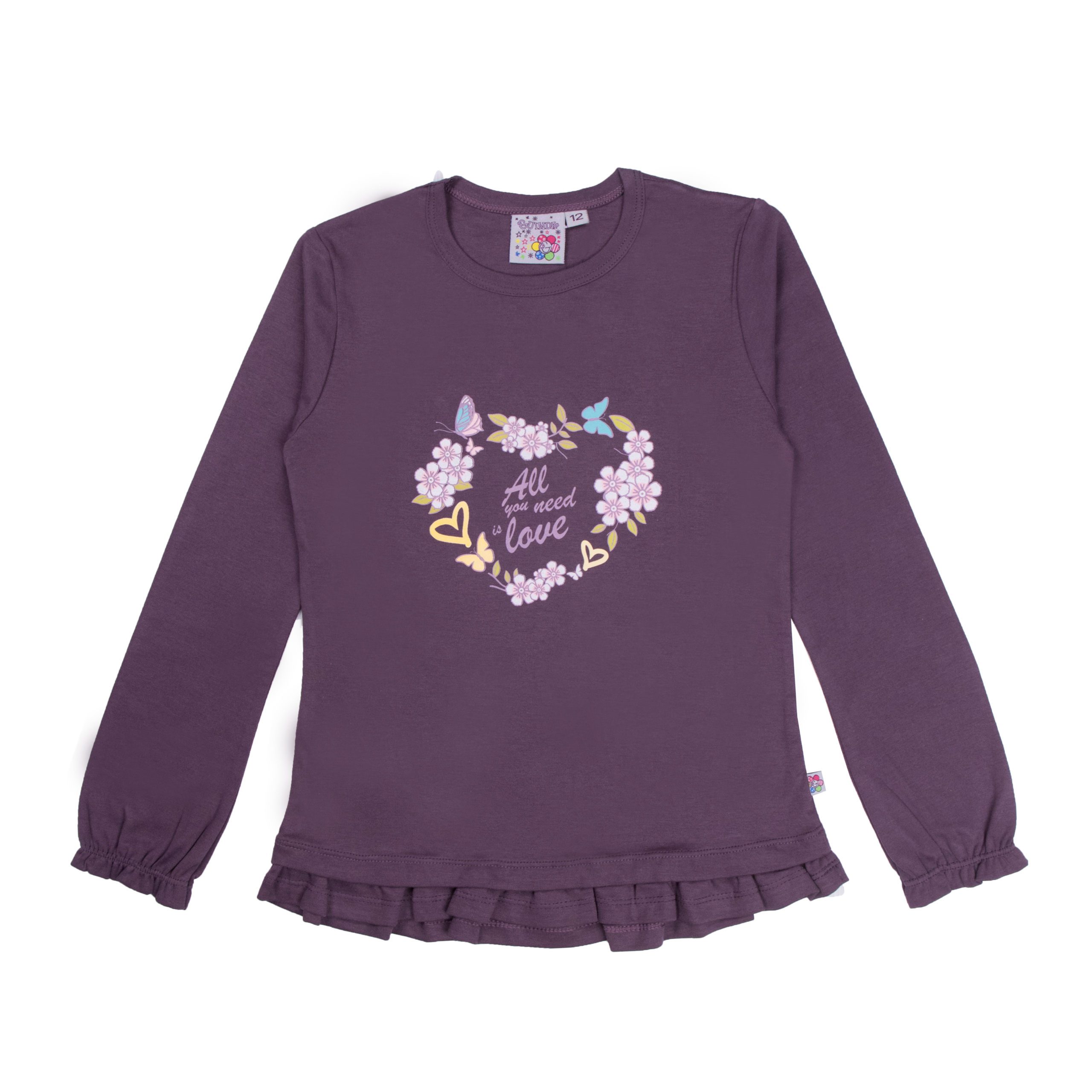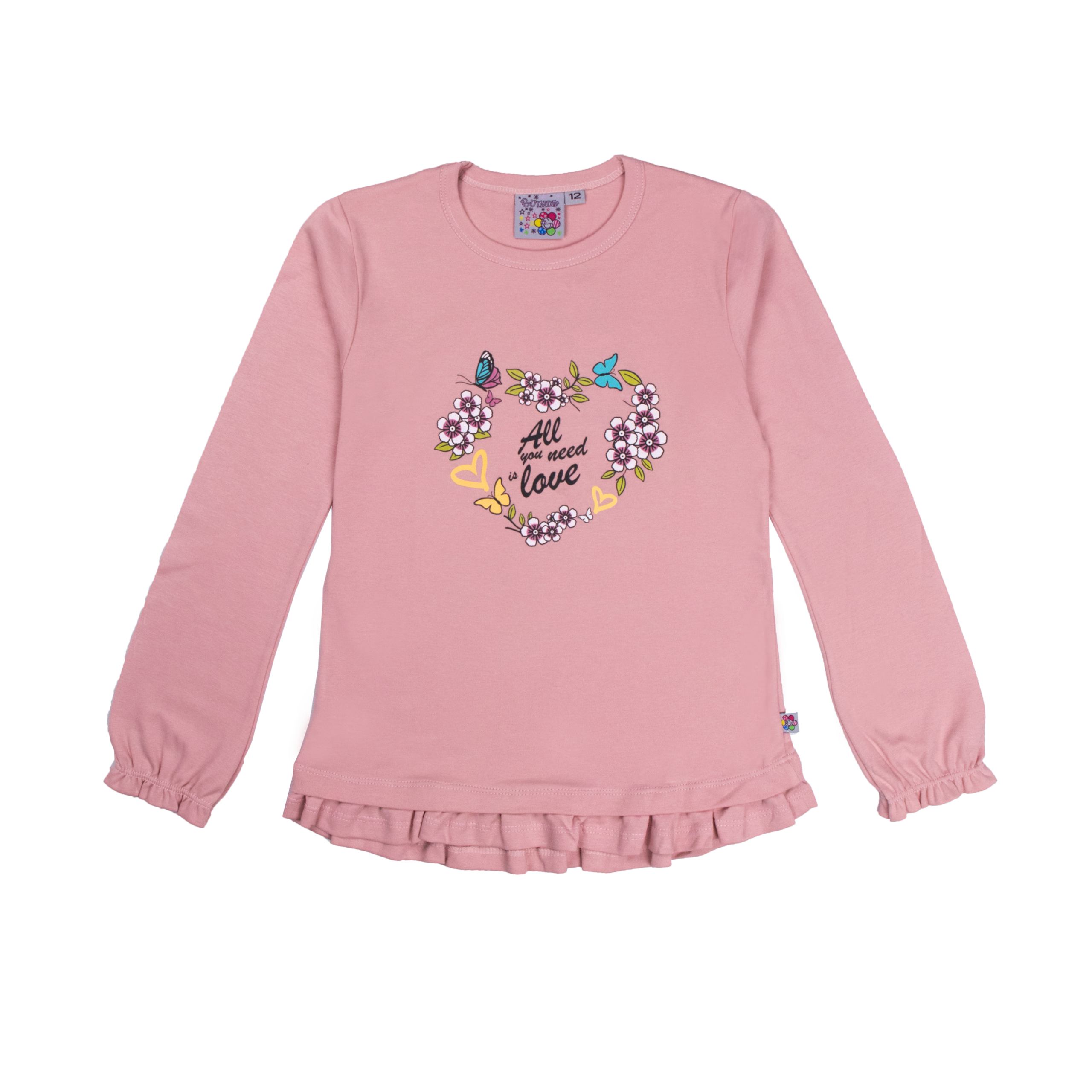 Polera color entero con mangas largas, con detalle de estampado de corazón de flores y texto «All you need is love», detalle plisado en los puños de las mangas y plisado en la parte de abajo de la prenda.
