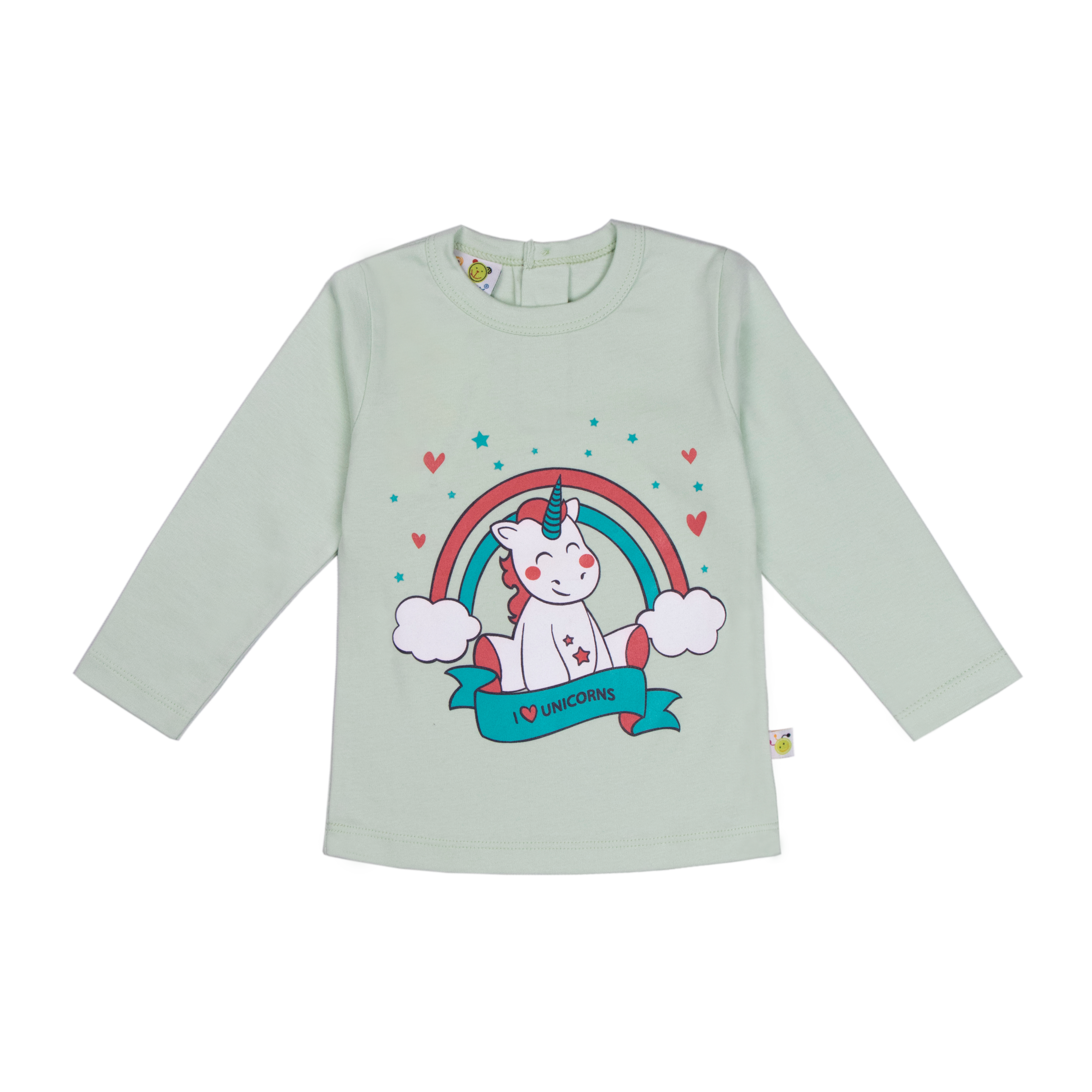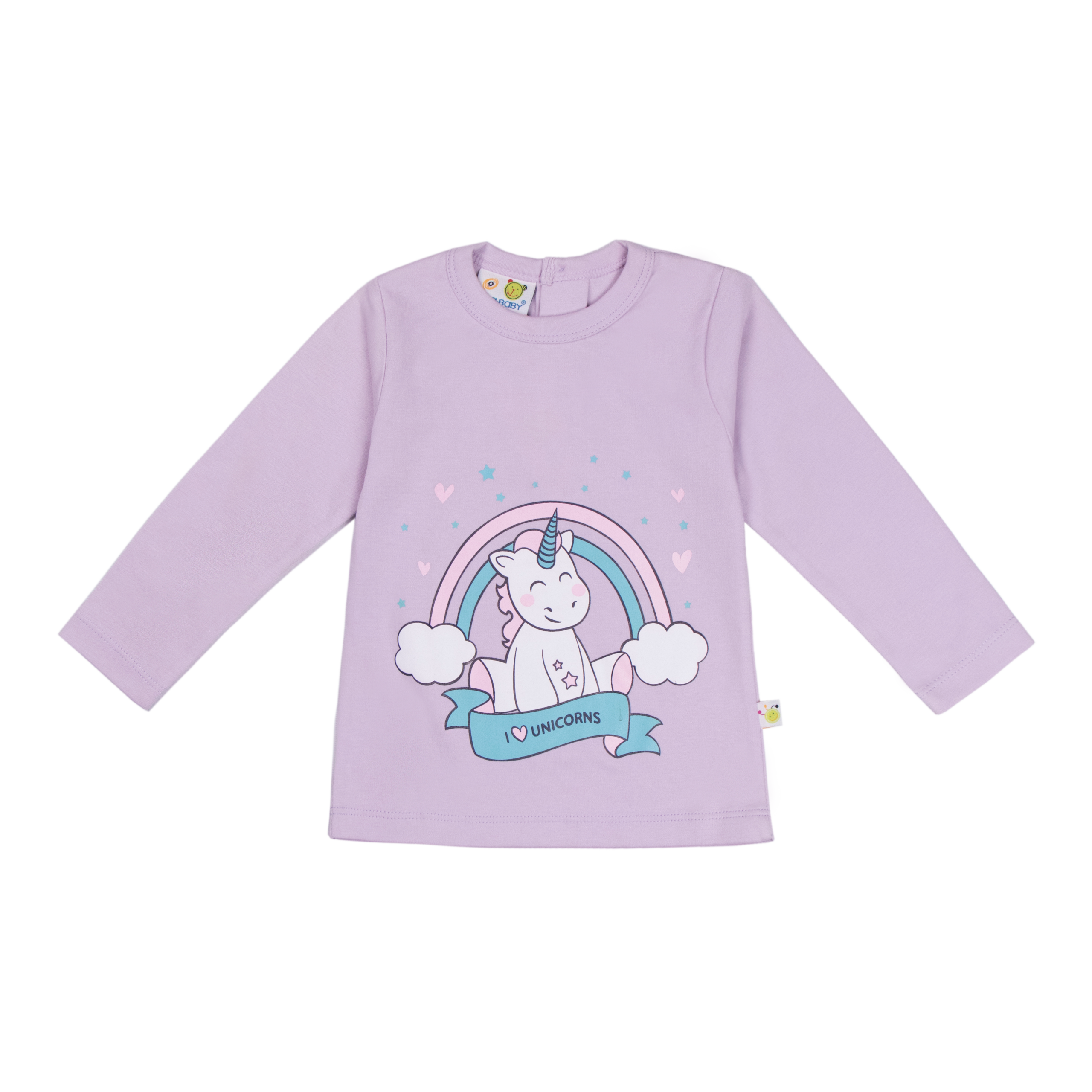 Polera manga larga de tela algodón en color entero con estampado de unicornio y arco iris en talles 1, 2 y 3.