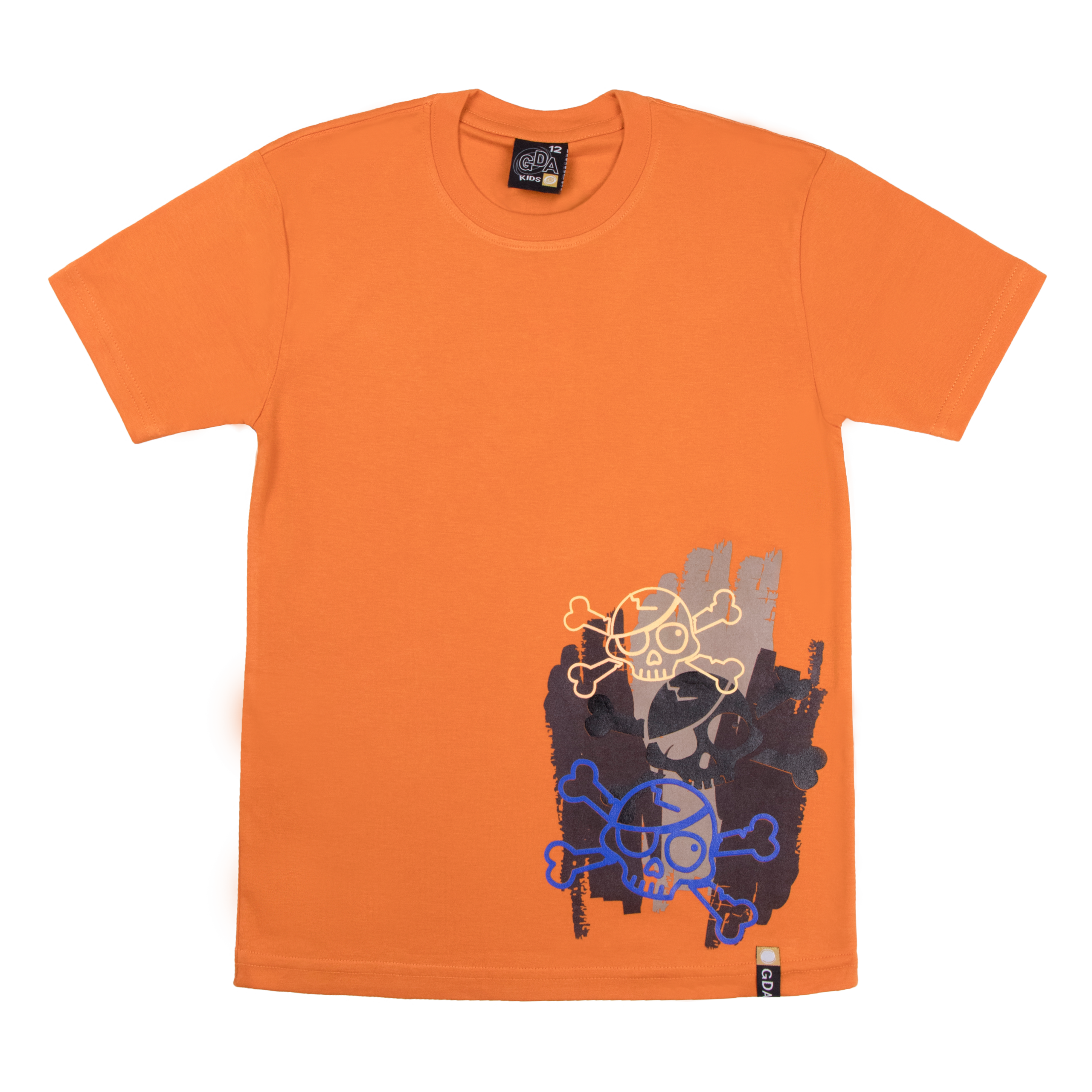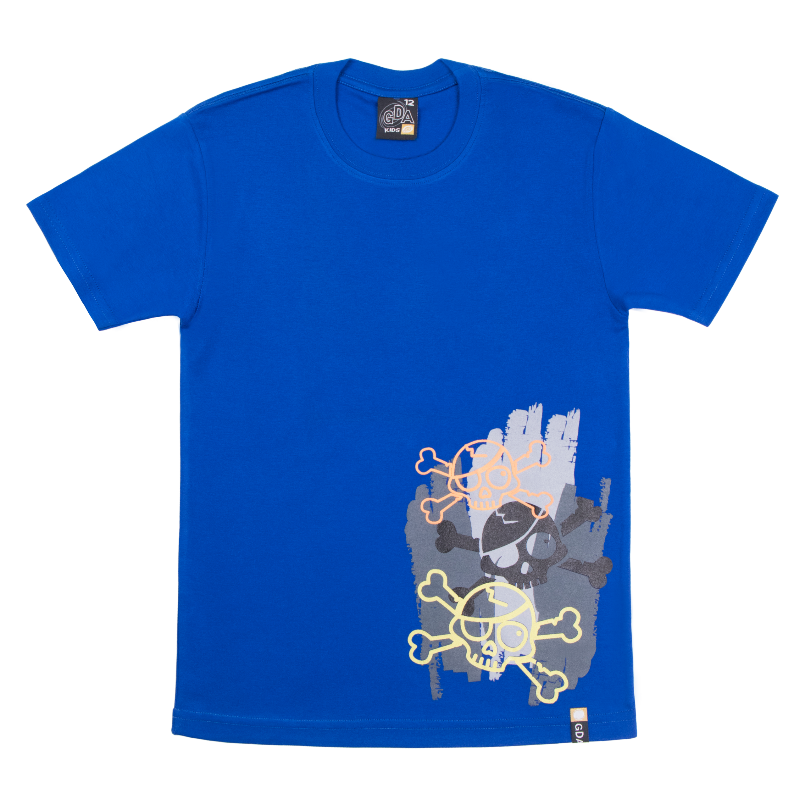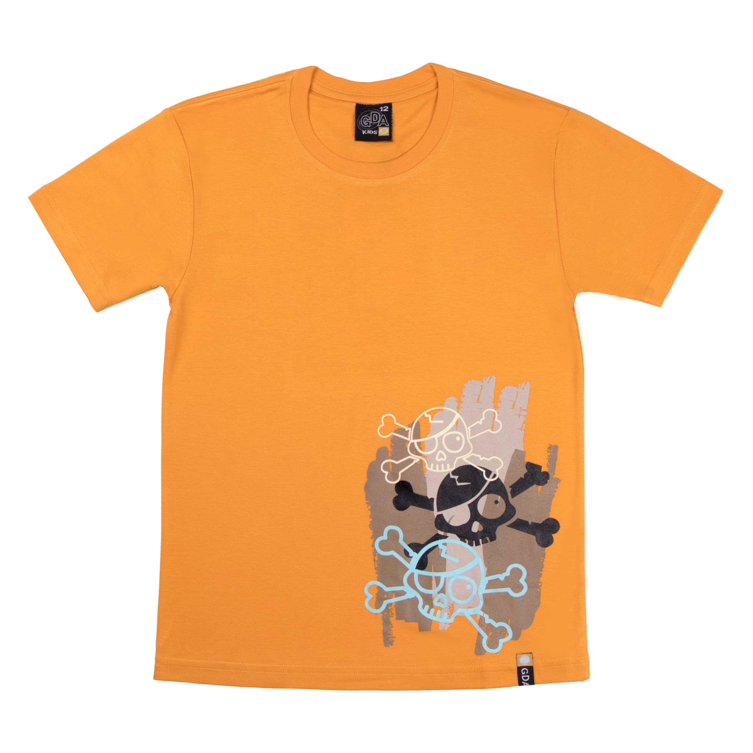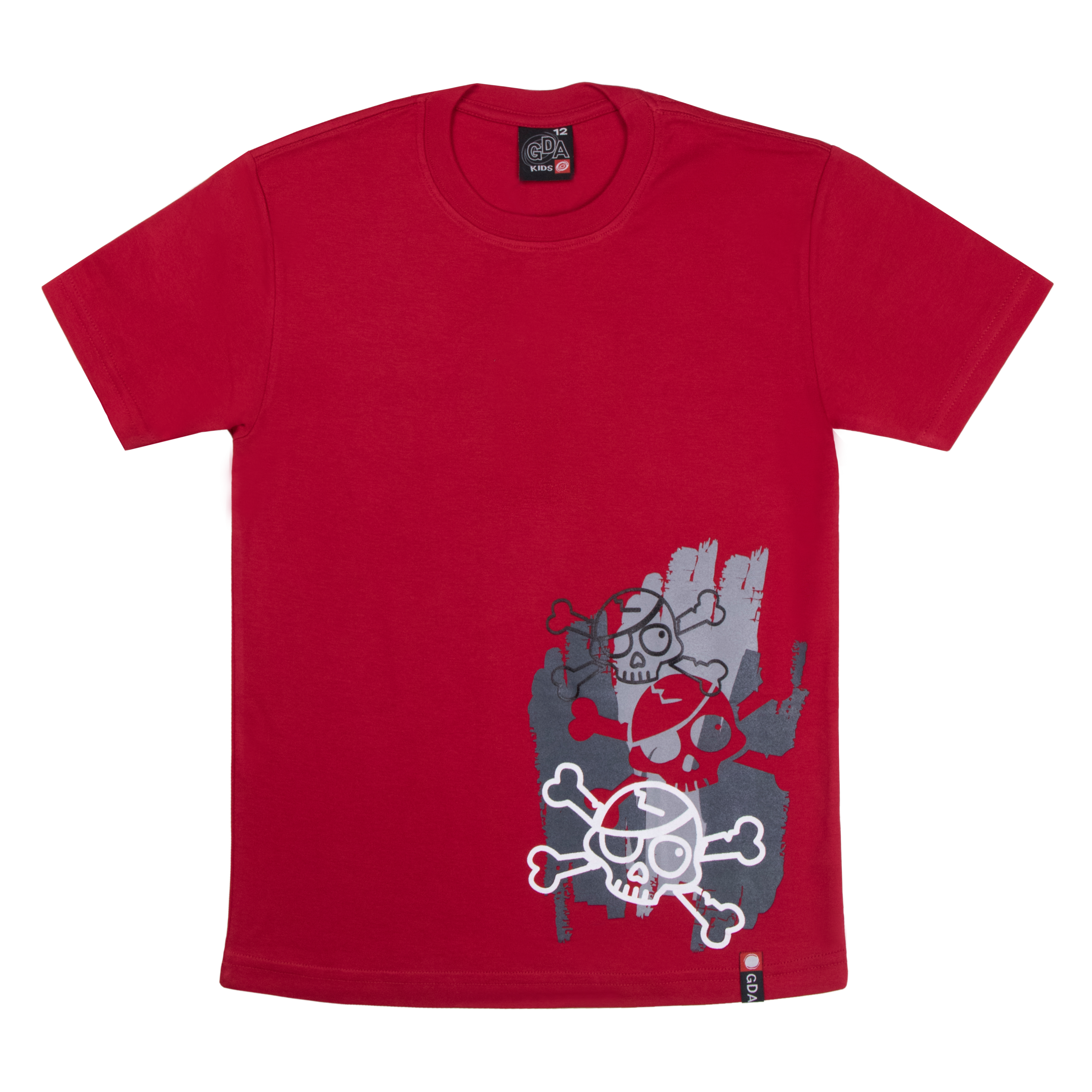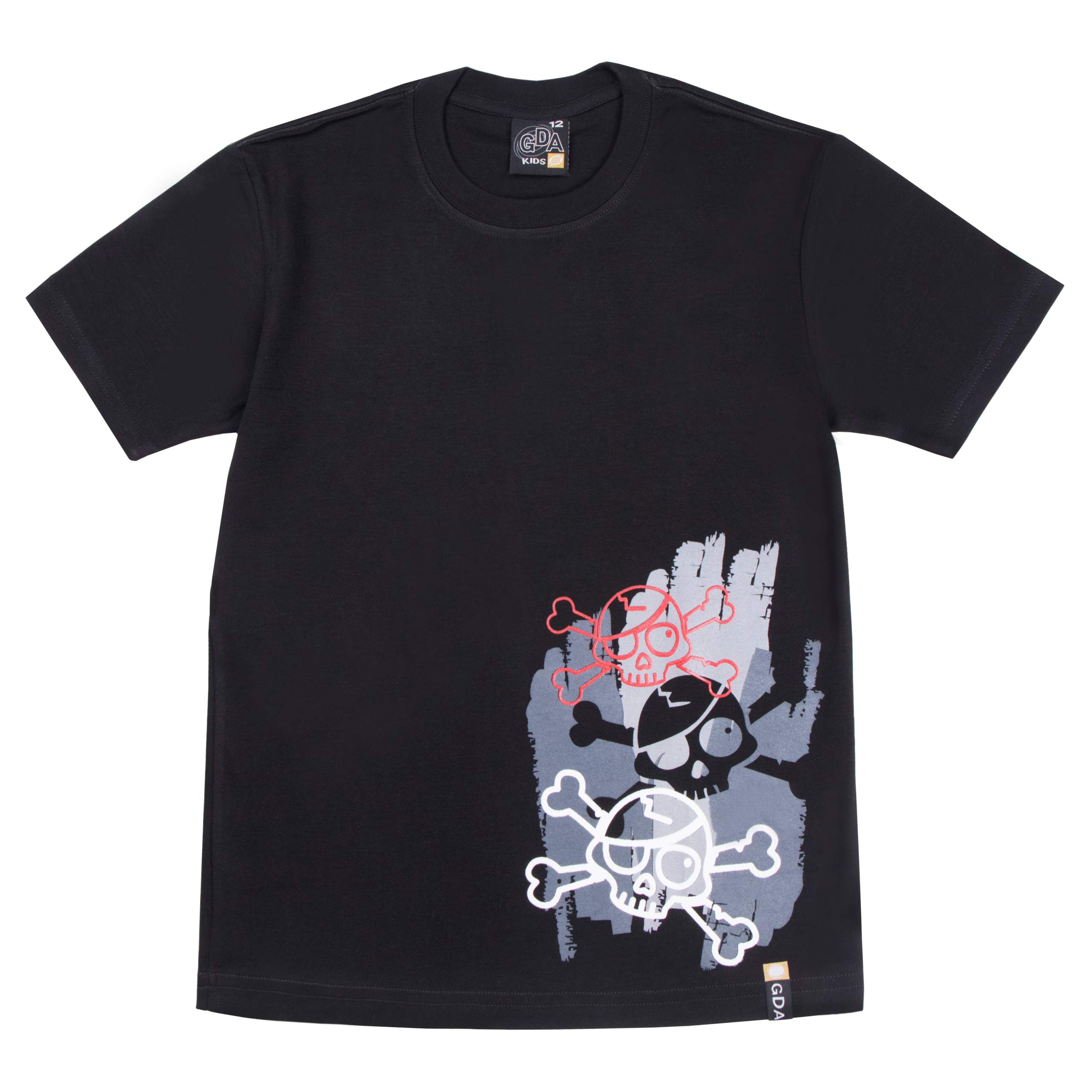 Polera manga corta en tela algodón con estampado de bandera pirata, en talles 10, 12 y 14.